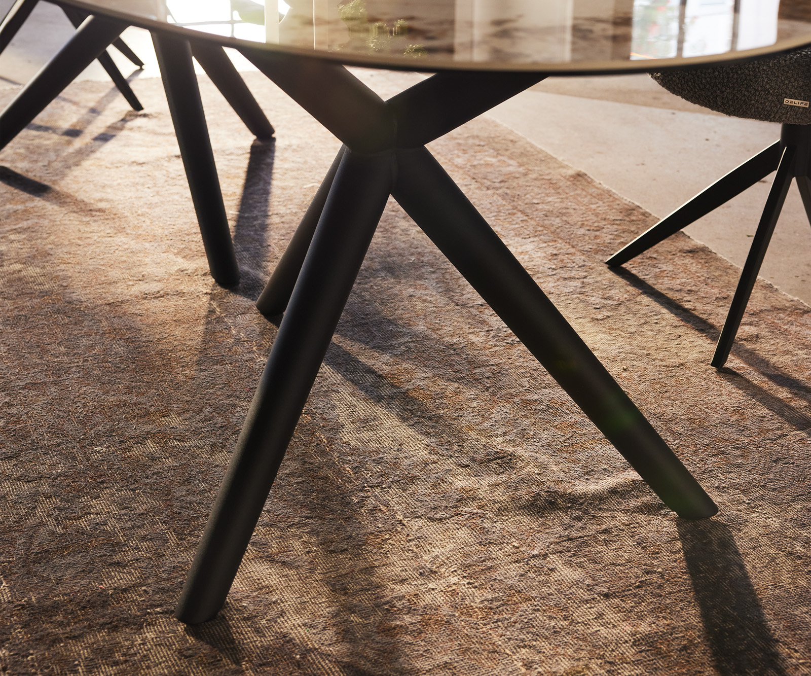 Az Edge asztal feltűnően ízléses eleganciáját az Estelar váza biztosítja, amely kiváló minőségű, porfestett fém matt fekete árnyalatban. A kerek váz középen van rögzítve az asztal alatt, kellemes lábtérrel ajándékoz meg, miközben a váz elegáns dizájnja lenyűgöző módon emeli ki az asztallap kifinomult báját.