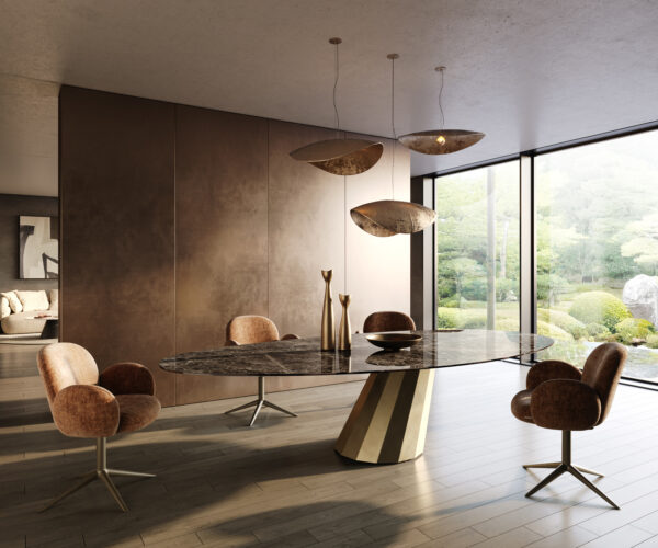 Étkezőasztal Edge ovális 315×150 cm kerámia emperador extra lucidato sötétbarna parabolikus metál arany