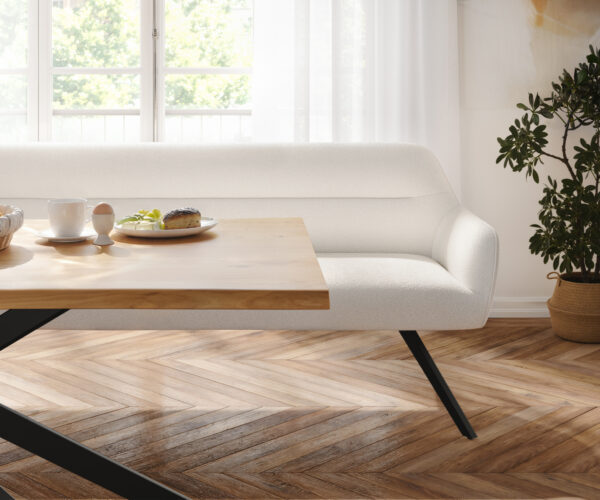Flex étkezőszékeink és Edge étkezőasztalaink tökéletesen követik a pad design nyelvezetét: a formák, vonalvezetés és lábak harmonikusan illeszkednek egymáshoz. Az 2 méteres Edge étkezőasztalok ideálisan kiegészítik ezt a padot. Ehhez ajánljuk a Flex székeket Yago, Zoa, Pejo, Heira vagy Xana modellekből, amelyeket kérésre azonos kárpittal választhat. Így egy stílusos, karakteres étkező jön létre, amely kifinomultságot sugároz – tökéletes összhangban.