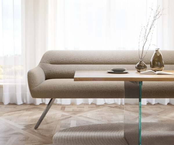 Flex étkezőszékeink és Edge étkezőasztalaink tökéletesen követik a pad design nyelvezetét: a formák, vonalvezetés és lábak harmonikusan illeszkednek egymáshoz. Az Edge asztalok 2 méteres hosszúságban ideálisan kiegészítik ezt a padot. Ehhez ajánljuk a Flex székeket Yago, Zoa, Pejo, Heira vagy Xana modellekből, amelyeket kérésre azonos kárpittal választhat. Így egy stílusos, tökéletesen összehangolt és karakteres étkezőteret hozhat létre.