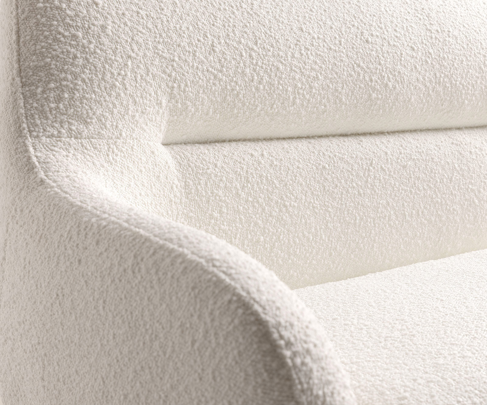 A világos krémfehér és kellemes tapintású bouclé struktúrájú szövet könnyedséget és eleganciát visz a lakótérbe. A magas színvonalú kidolgozás és a puha tapintás stílusos választássá teszi a mindennapi kényelmes ülőbútorokhoz.