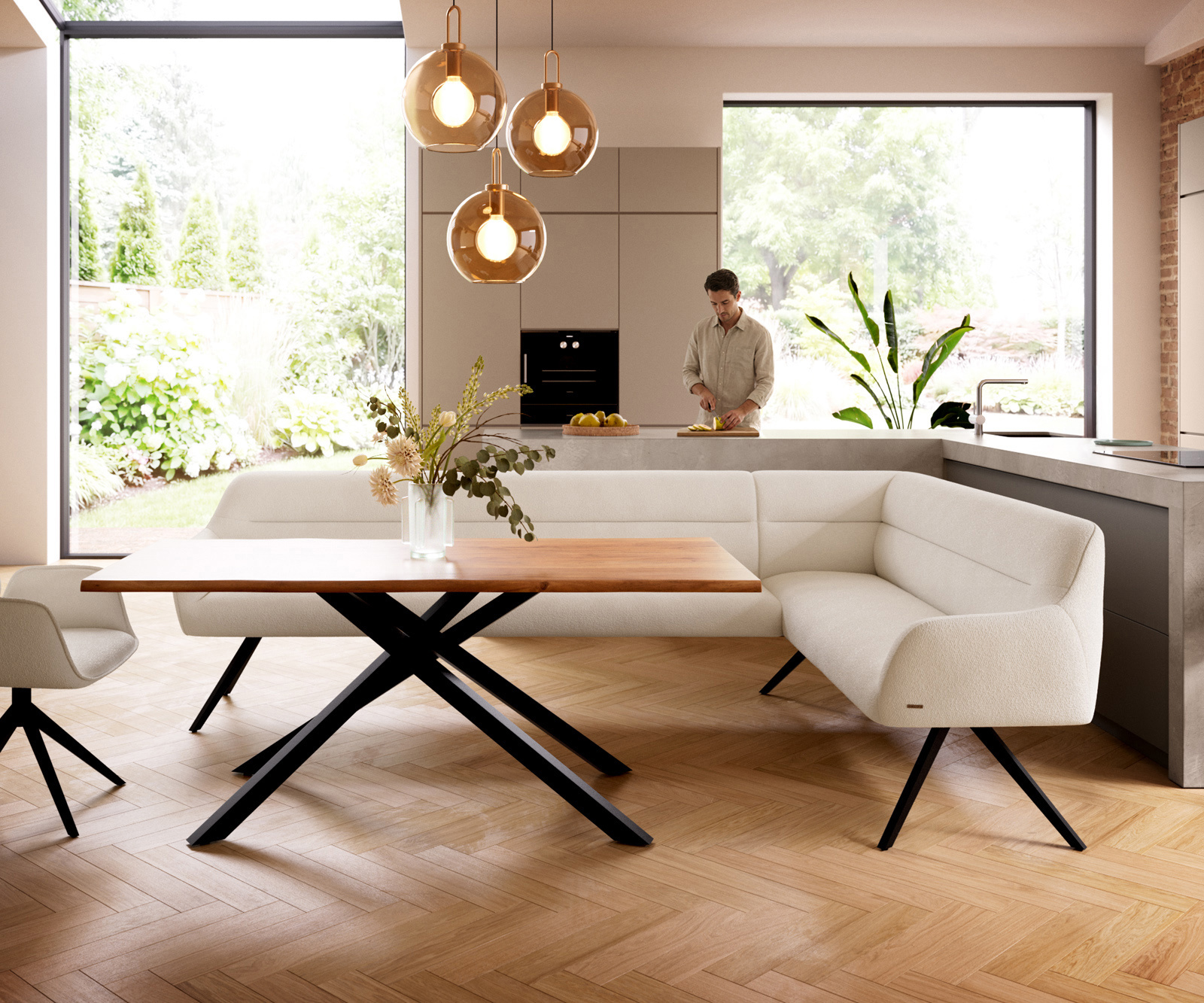 A jól átgondolt rendszerünk részeként a Taya sarokpad ideálisan kombinálható Flex étkezőszékeinkkel és Edge étkezőasztalainkkal. A formák, vonalvezetés és lábak tökéletes összhangban vannak egymással, így harmonikus összképet alkotnak az étkezőben. Ehhez a sarokmegoldáshoz különösen alkalmasak az 2 méter hosszú Edge étkezőasztalok. Ehhez illően ajánljuk a Flex székeket Yago, Zoa, Pejo, Heira vagy Xana modellekből, amelyeket kérésre azonos kárpittal választhat. Így egy stílusos, karakteres étkező jön létre – tökéletesen összehangolva és egyedi megjelenéssel.