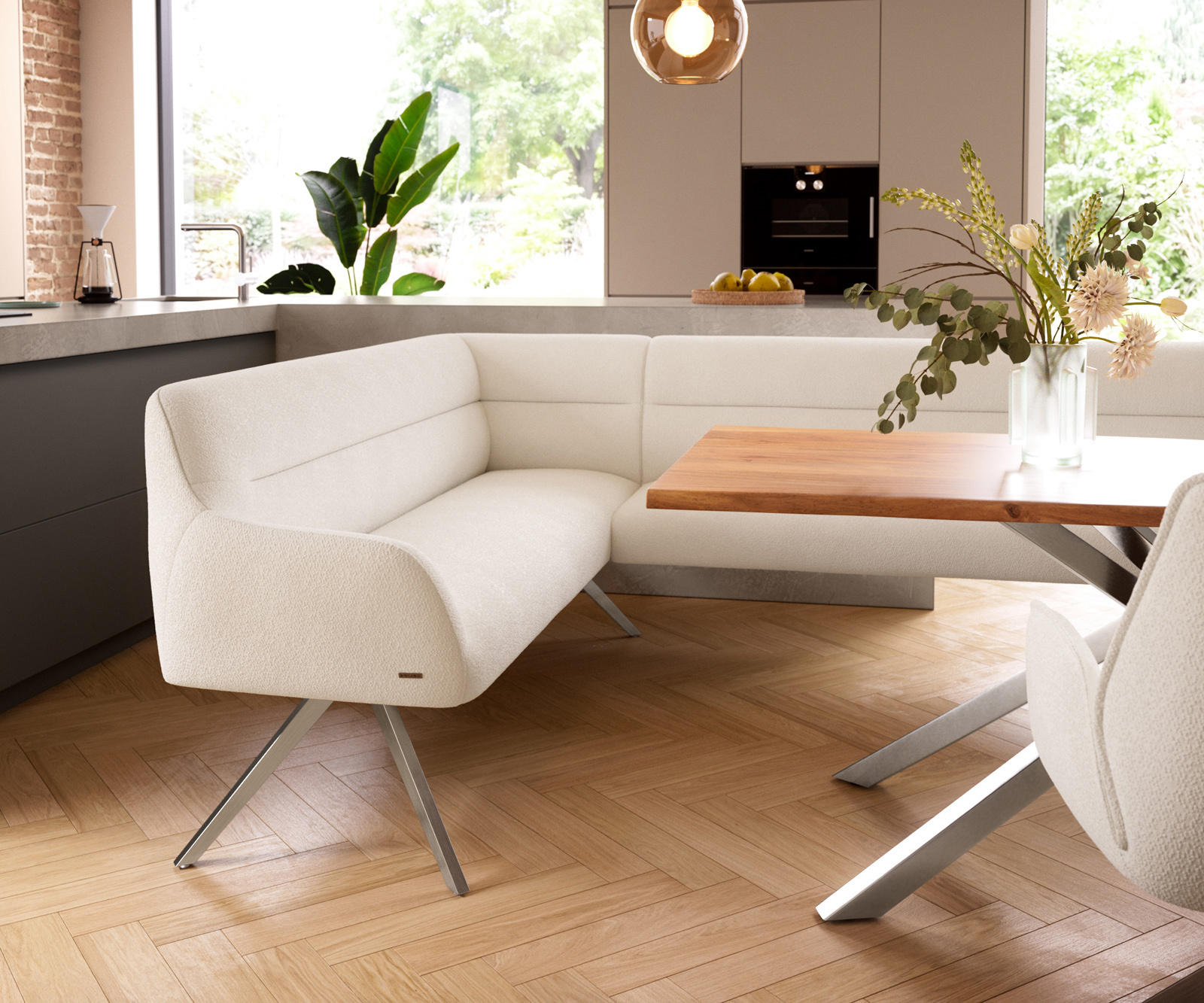 A jól átgondolt rendszerünk részeként a Taya sarokpad ideálisan kombinálható Flex étkezőszékekkel és Edge étkezőasztalokkal. A formák, vonalvezetés és lábak tökéletes harmóniában vannak egymással, így egységes összképet alkotnak az étkezőben. Ehhez a sarokmegoldáshoz különösen alkalmasak az 2 méteres Edge asztalok. Ehhez ajánljuk a Flex székeket Yago, Zoa, Pejo, Heira vagy Xana modellekből, amelyeket kérésre azonos kárpittal választhat. Így egy stílusos, tökéletesen összehangolt és karakteres étkező jön létre.