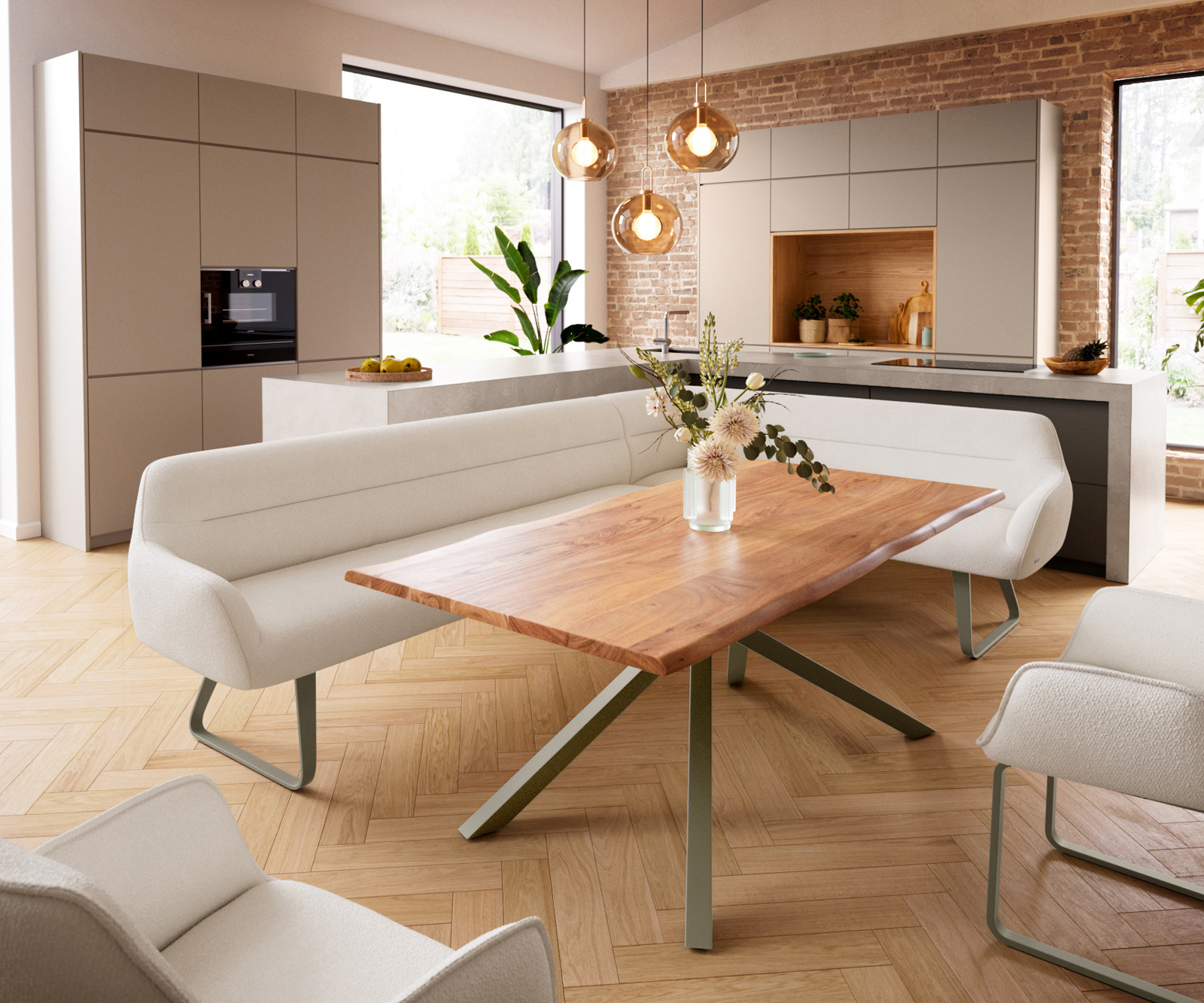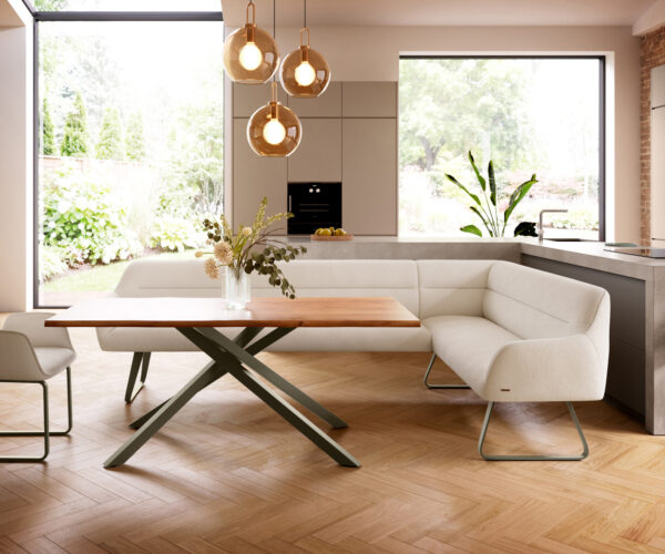 A jól átgondolt rendszerünk részeként a Taya sarokpad ideálisan kombinálható Flex étkezőszékekkel és Edge étkezőasztalokkal. A formák, vonalvezetés és lábak tökéletes harmóniában vannak egymással, így egységes összképet alkotnak az étkezőben. Ehhez a sarokmegoldáshoz különösen alkalmasak az 2 méteres Edge étkezőasztalok. Ehhez ajánljuk a Flex székeket Yago, Zoa, Pejo, Heira vagy Xana modellekből, amelyeket kérésre azonos kárpittal választhat. Így egy stílusos, karakteres és tökéletesen összehangolt étkezőteret hozhat létre.