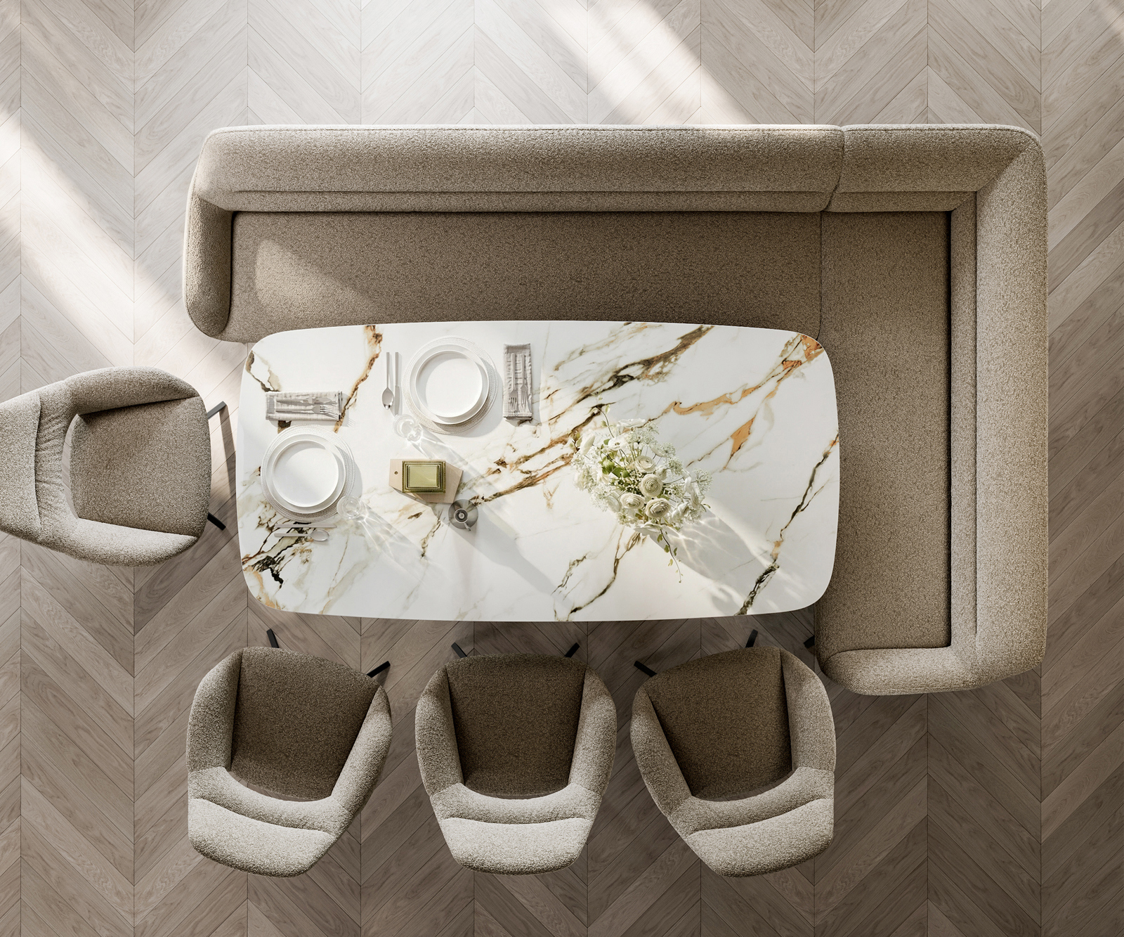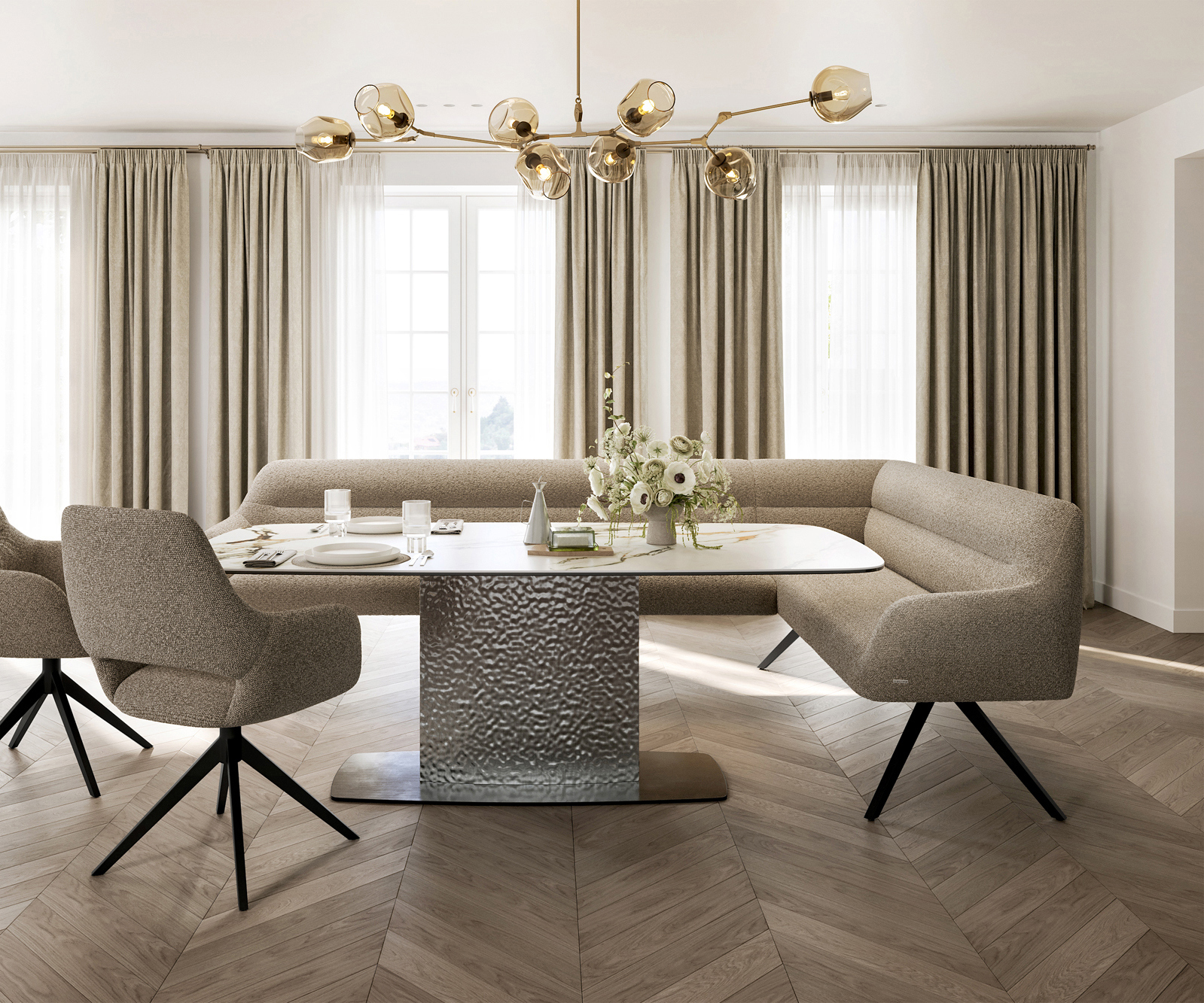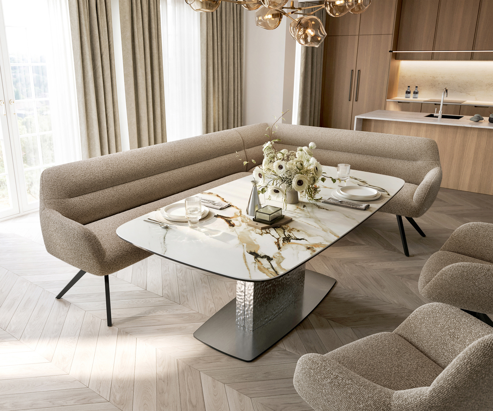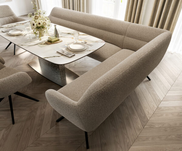 A jól átgondolt rendszerünk részeként a Taya sarokpad ideálisan kombinálható Flex étkezőszékeinkkel és Edge étkezőasztalainkkal. A formák, vonalvezetés és lábak tökéletes összhangban vannak egymással, így harmonikus összképet alkotnak az étkezőben. Ehhez a sarokmegoldáshoz különösen alkalmasak az 2 méter hosszú Edge étkezőasztalok. Ehhez illeszkedően ajánljuk a Flex székeket Yago, Zoa, Pejo, Heira vagy Xana modellekből, amelyeket kérésre azonos kárpittal választhat. Így egy stílusos, karakteres étkező jön létre – tökéletesen összehangolt és egyedi.