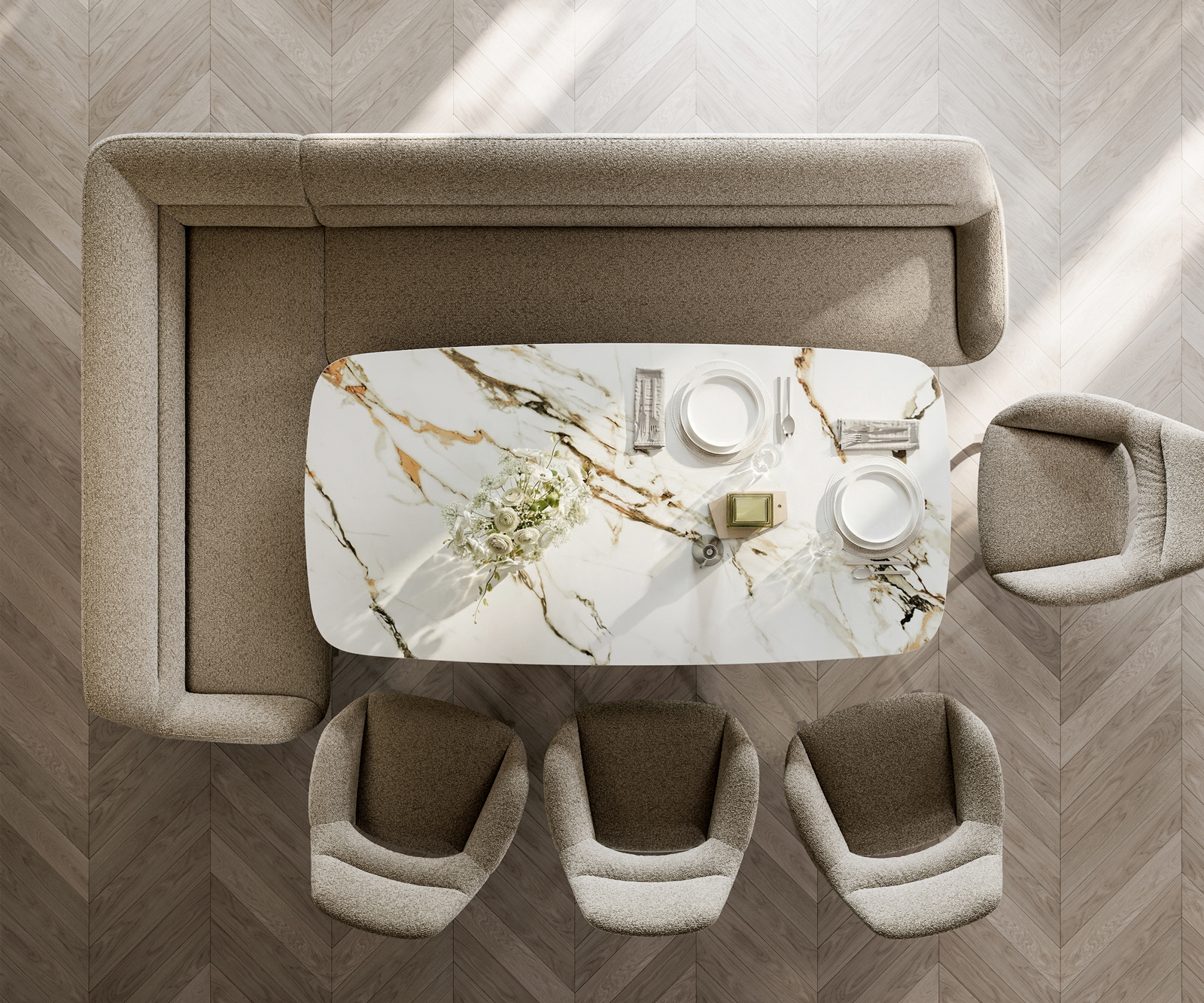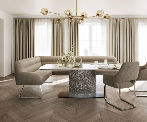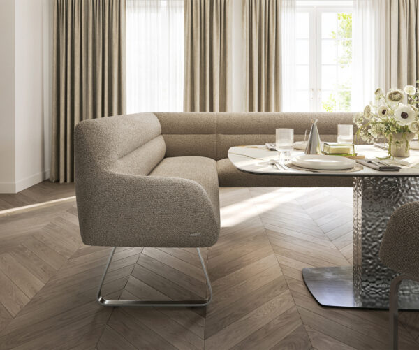 A gondosan megtervezett rendszer részeként a Taya sarokpad ideálisan kombinálható Flex étkezőszékeinkkel és Edge étkezőasztalainkkal. A formák, vonalvezetés és lábak tökéletes harmóniában vannak egymással, így egységes összképet alkotnak az étkezőben. Ehhez a sarokmegoldáshoz különösen alkalmasak az 2 méter hosszú Edge étkezőasztalok. Ehhez illően ajánljuk a Flex székeket Yago, Zoa, Pejo, Heira vagy Xana modellekből, amelyeket kérésre azonos kárpittal választhat. Így egy stílusos, tökéletesen összehangolt és karakteres étkezőteret hozhat létre.