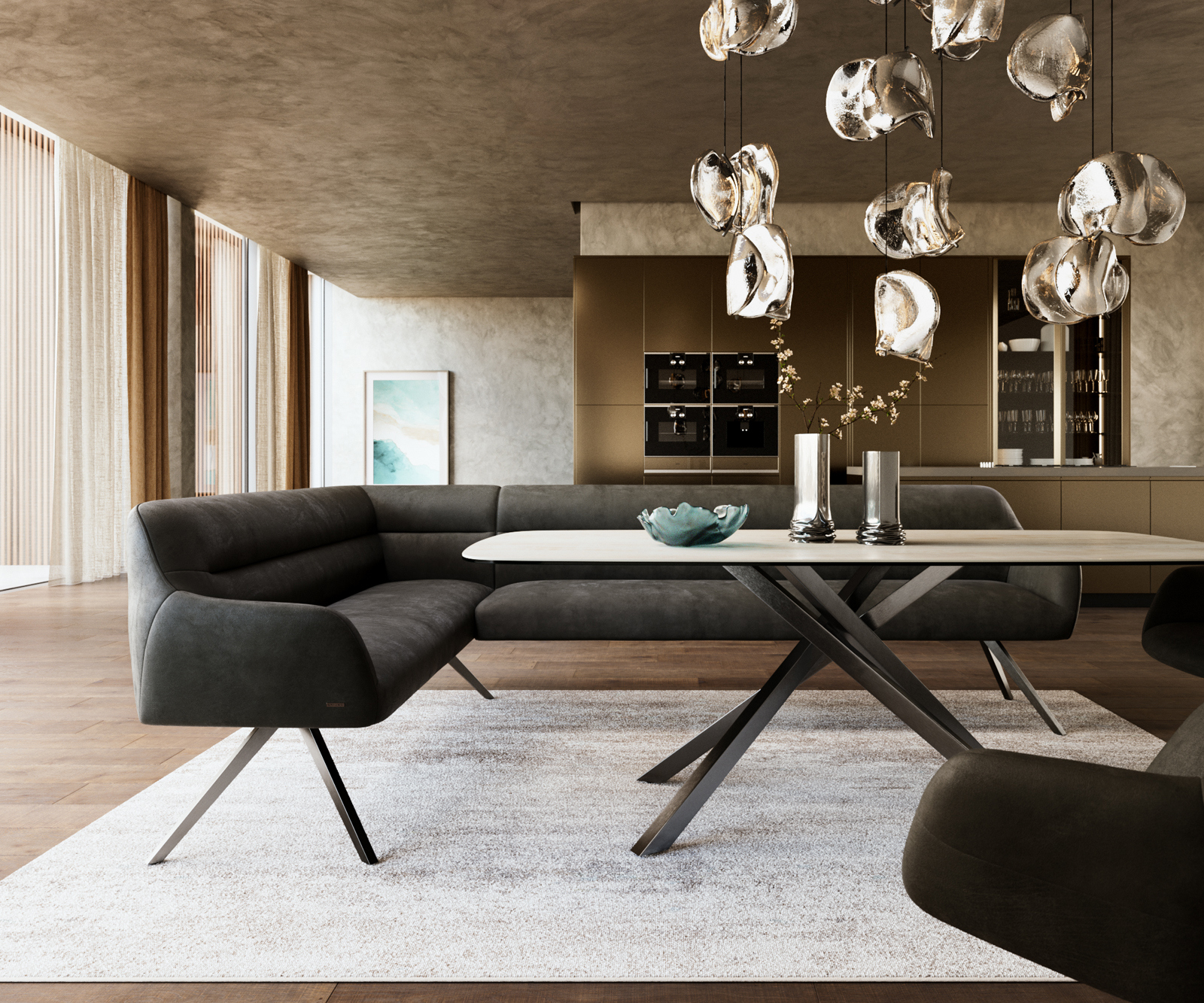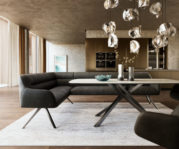 A jól átgondolt rendszerünk részeként a Taya sarokpad ideálisan kombinálható a Flex étkezőszékekkel és Edge étkezőasztalokkal. A formák, vonalvezetés és lábak tökéletes harmóniában vannak egymással, így egységes összképet alkotnak az étkezőben. Ehhez a sarokmegoldáshoz különösen alkalmasak az 2 méter hosszú Edge asztalok. Ehhez illően ajánljuk a Flex székeket: Yago, Zoa, Pejo, Heira vagy Xana modelleket, amelyeket kérésre azonos huzatban is választhat. Így egy stílusérzékkel bíró, tökéletesen összehangolt és karakteres étkezőhelyiség jön létre.