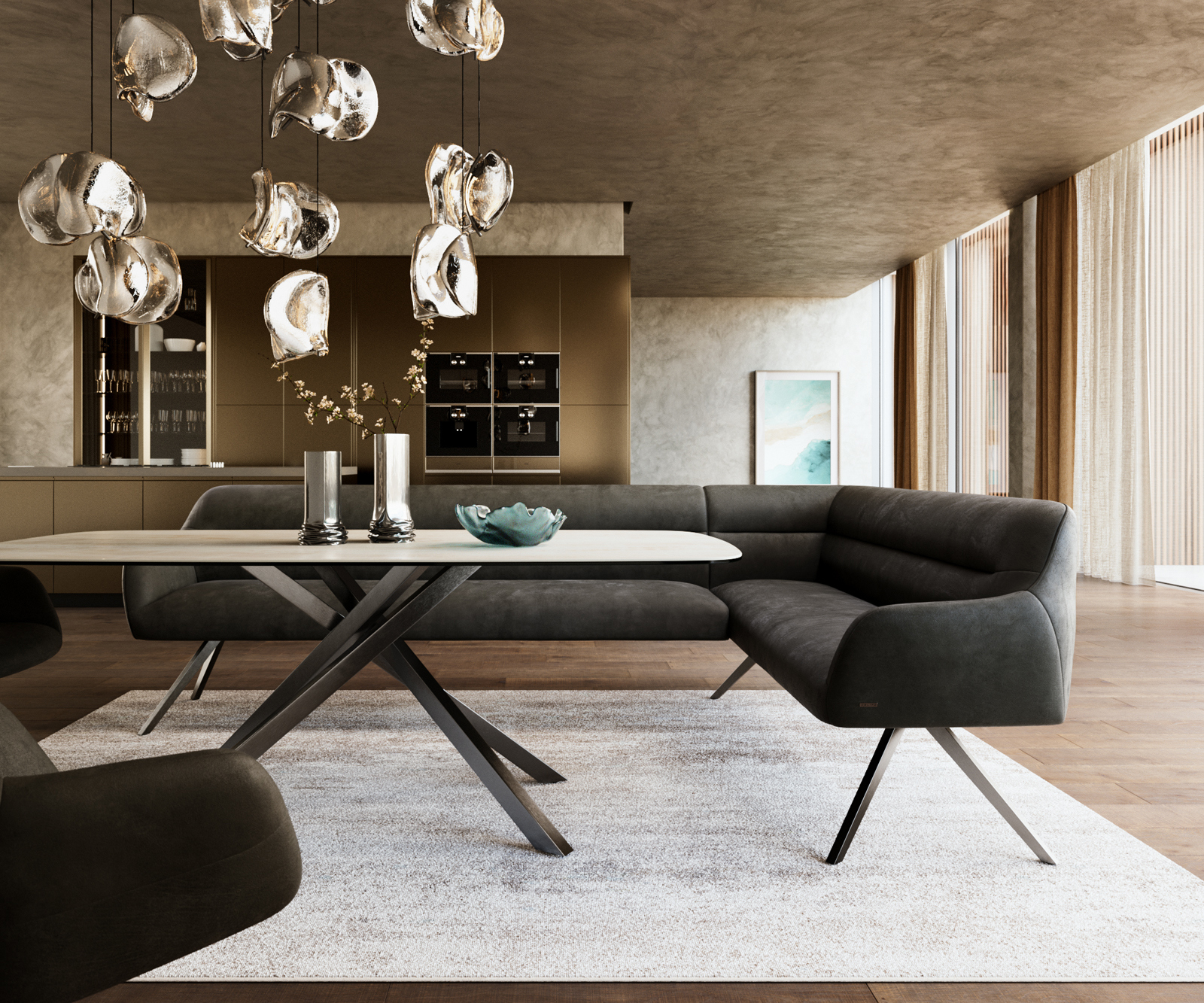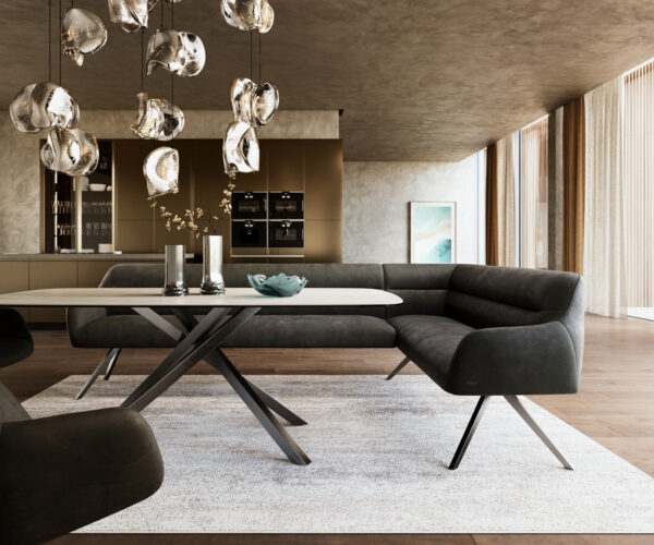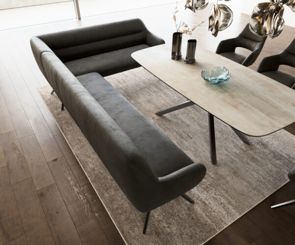 A jól átgondolt rendszerünk részeként a Taya sarokpad ideálisan kombinálható a Flex étkezőszékekkel és Edge étkezőasztalokkal. A formák, vonalvezetés és lábak tökéletes harmóniában vannak egymással, így egységes összképet alkotnak az étkezőben. Ehhez a sarokmegoldáshoz különösen alkalmasak az 2 méter hosszú Edge asztalok. Ehhez illően ajánljuk a Flex székeket: Yago, Zoa, Pejo, Heira vagy Xana modelleket, amelyeket kérésre azonos huzatban is választhat. Így egy stílusérzékkel bíró, tökéletesen összehangolt és karakteres étkezőhelyiség jön létre.