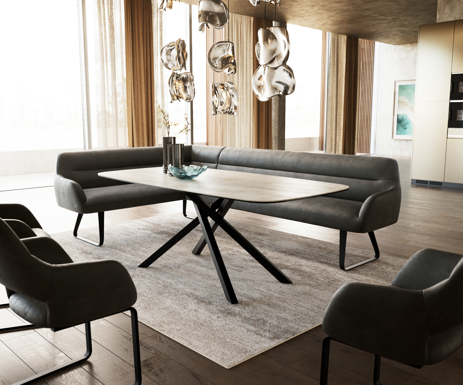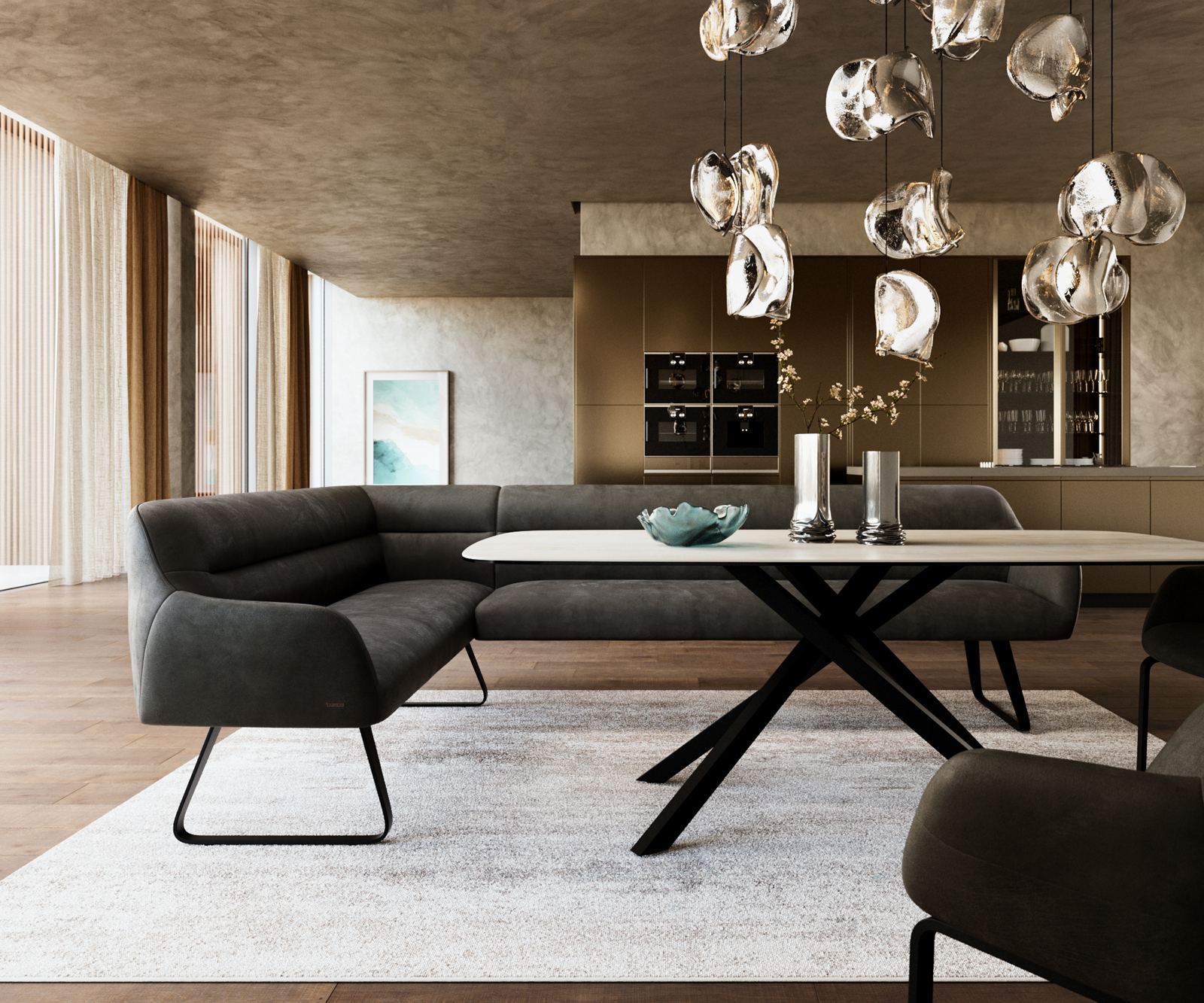 A jól átgondolt rendszerünk részeként a Taya sarokpad ideálisan kombinálható Flex étkezőszékeinkkel és Edge étkezőasztalainkkal. A formák, vonalvezetés és lábak tökéletes harmóniában vannak egymással, így egységes összképet alkotnak az étkezőben. Ehhez a sarokmegoldáshoz különösen alkalmasak az 2 méter hosszú Edge asztalok. Ehhez ajánljuk a Flex székeket Yago, Zoa, Pejo, Heira vagy Xana modellekből, amelyeket kérésre azonos kárpittal is választhat. Így egy stílusos, karakteres étkezőhelyiség jön létre, amely tudatos ízlést tükröz – tökéletesen összehangolt és egyedi.