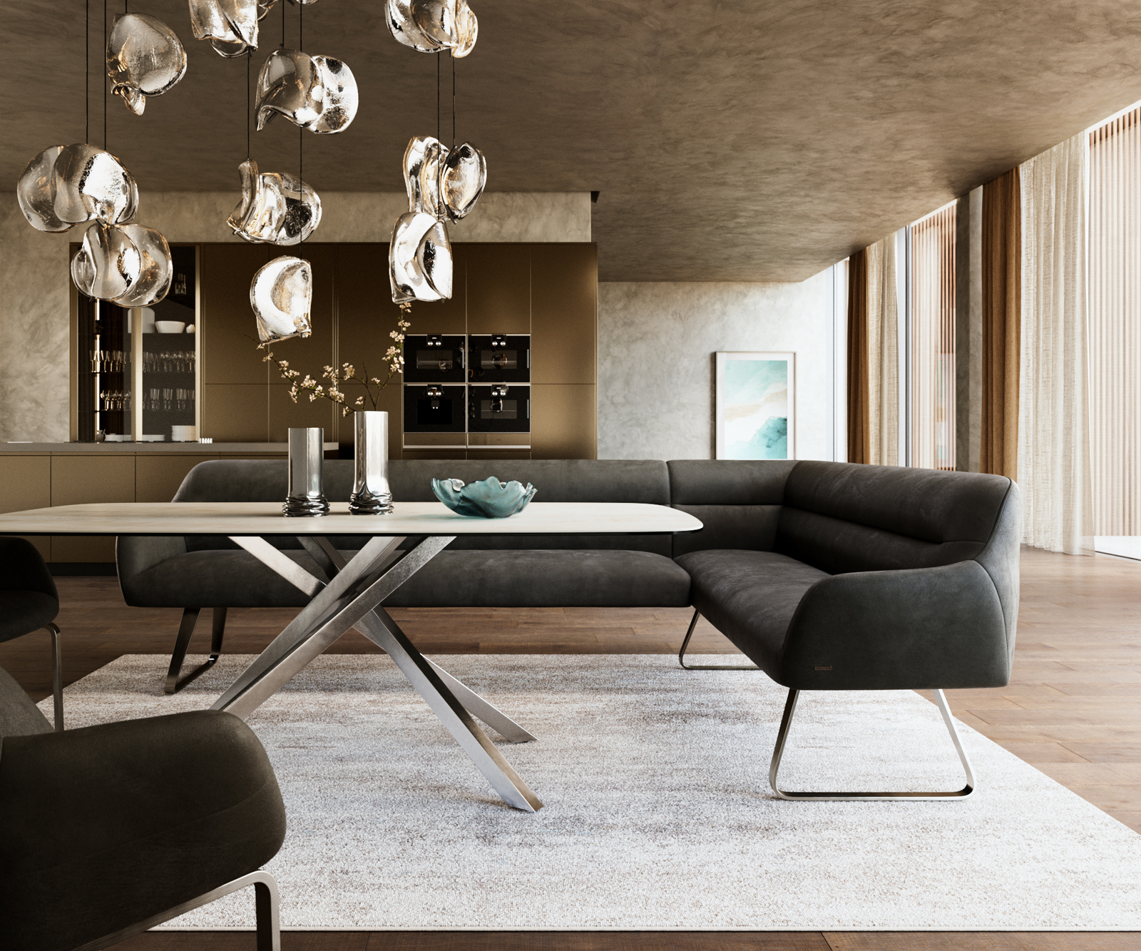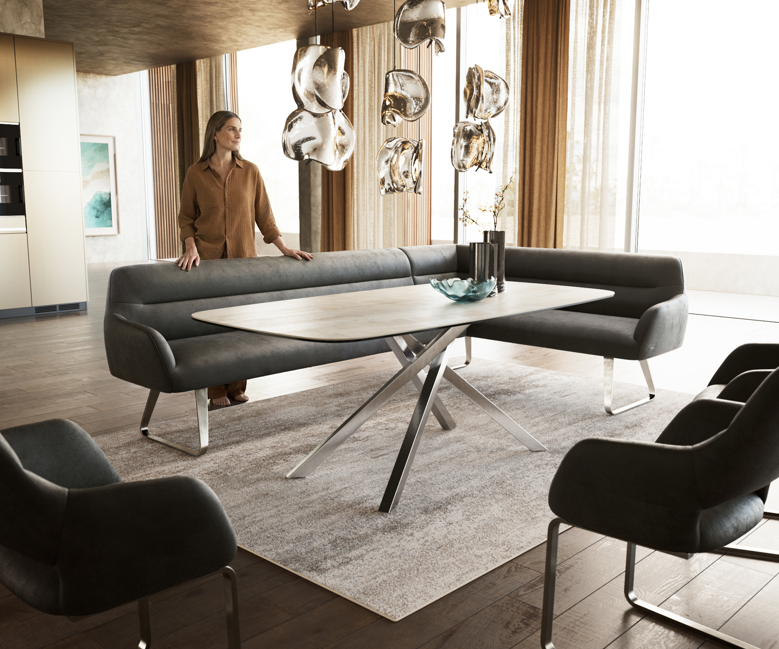 A gondosan megtervezett rendszerünk részeként a Taya sarokpad ideálisan kombinálható Flex étkezőszékeinkkel és Edge étkezőasztalainkkal. A formák, vonalvezetés és lábak tökéletes harmóniában vannak egymással, így egységes összképet alkotnak az étkezőben. Ehhez a sarokmegoldáshoz különösen alkalmasak az 2 méteres Edge asztalok. Ehhez ajánljuk a Flex székeket Yago, Zoa, Pejo, Heira vagy Xana modellekből, amelyeket kérésre azonos huzatban is választhat. Így egy stílusos, karakteres étkezőteret hozhat létre, amely tudatosan összehangolt és egyedi.