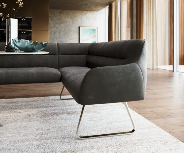 A Taya sarokpad könnyedséget és modern eleganciát ötvöz. A finom szegélyvarrás és a lágyan ívelt forma harmonikus összképet alkot. Belsejében egy kiváló minőségű szendvics szerkezet található, amely habból (RG 40 kg/m³), zsákrugóból és hullámrugós alátámasztásból áll, így rendkívüli üléskomfortot és hosszú távú formastabilitást biztosít. Két harmonikusan összehangolt kárpitozott elem alkot egy sarokmegoldást, amely áramló, elegáns hatást kelt. A speciálisan kifejlesztett fém láb rendkívüli stabilitást nyújt, és teljesen láthatatlan támasztólábak nélkül valósul meg – egy innovatív megoldás, amely a konzolos design-t megbízható tartóssággal ötvözi.