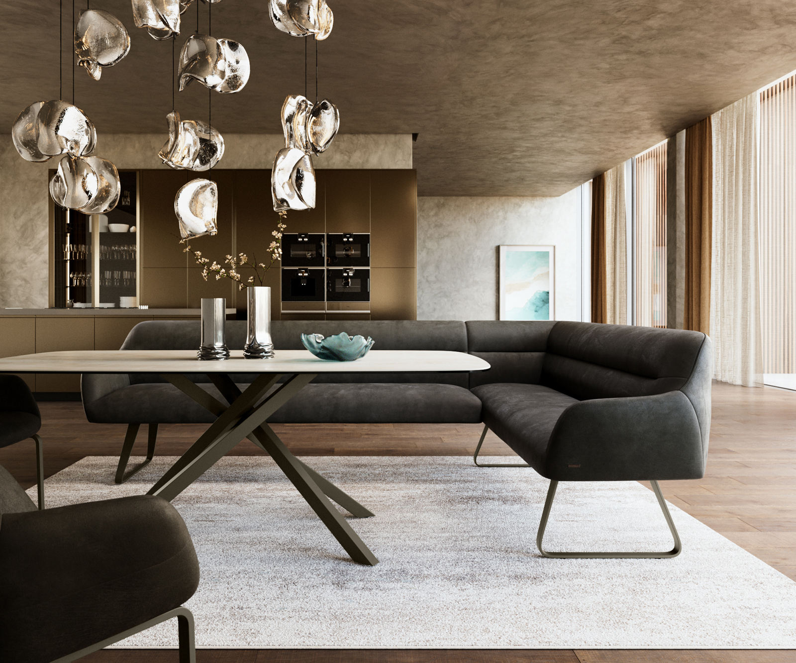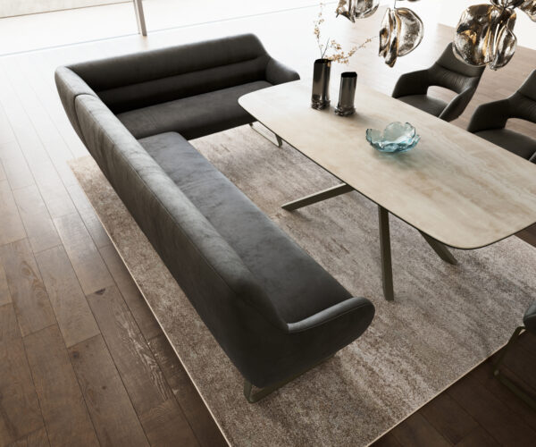A jól átgondolt rendszerünk részeként a Taya sarokpad ideálisan kombinálható Flex étkezőszékeinkkel és Edge étkezőasztalainkkal. A formák, vonalvezetés és lábak tökéletes harmóniában vannak egymással, így egységes összképet alkotnak az étkezőben. Ehhez a sarokmegoldáshoz különösen alkalmasak az 2 méteres Edge asztalok. Ehhez illően ajánljuk a Flex székeket Yago, Zoa, Pejo, Heira vagy Xana modellekből, amelyeket kérésre azonos kárpittal is választhat. Így egy stílusos, karakteres étkező jön létre – tökéletes összhangban és egyedi megjelenéssel.
