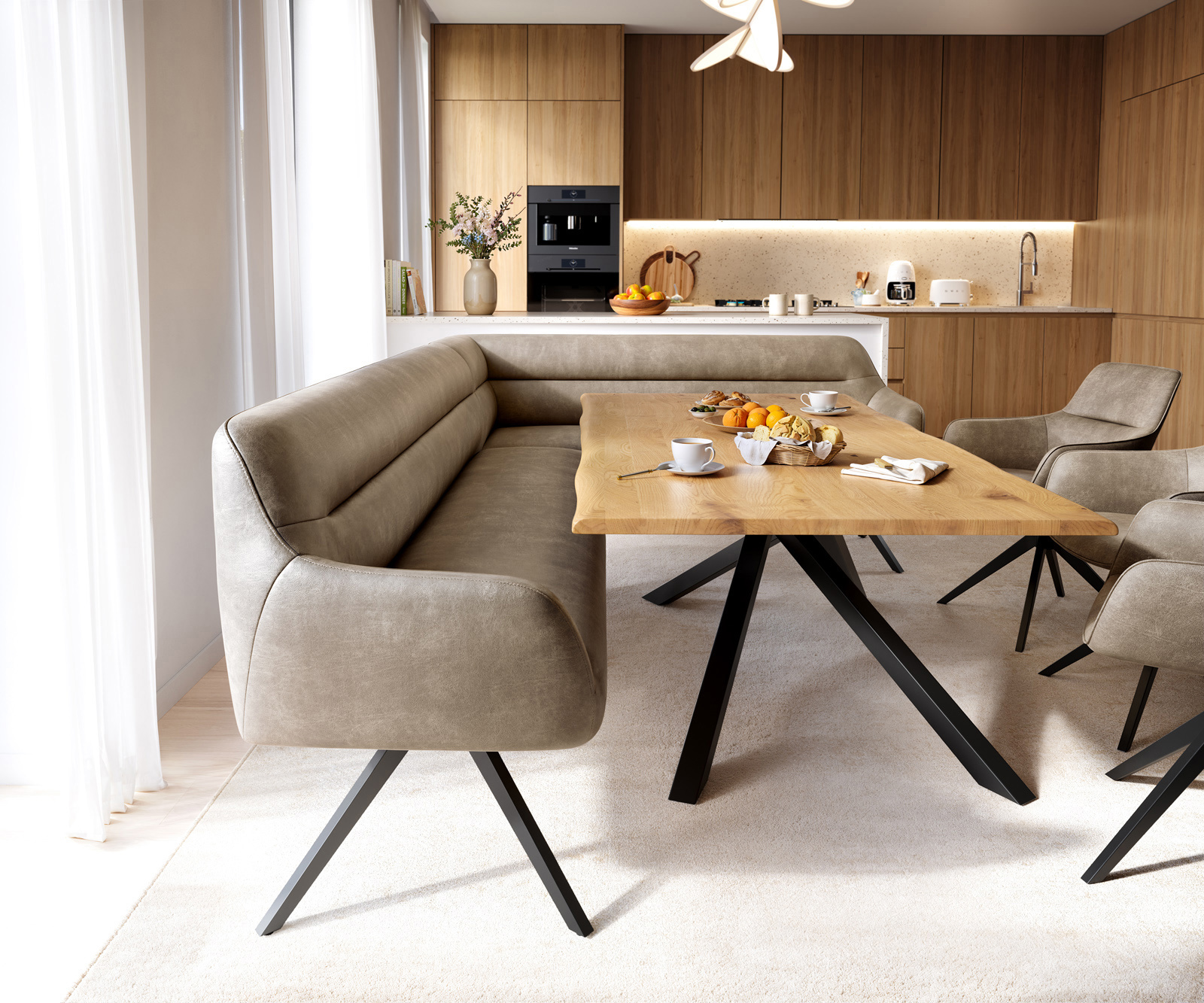 A jól átgondolt rendszerünk részeként a Taya sarokpad ideálisan kombinálható Flex étkezőszékeinkkel és Edge étkezőasztalainkkal. A formák, vonalvezetés és lábak tökéletes harmóniában vannak egymással, így egységes összképet alkotnak az étkezőben. Ehhez a sarokmegoldáshoz különösen alkalmasak az 2 méter hosszú Edge asztalok. Ehhez illően ajánljuk a Flex székeket Yago, Zoa, Pejo, Heira vagy Xana modellekből, amelyeket kérésre azonos kárpittal választhat. Így egy stílusos, karakteres étkezőhelyiség jön létre – tökéletes összhangban és egyedi hangulattal.