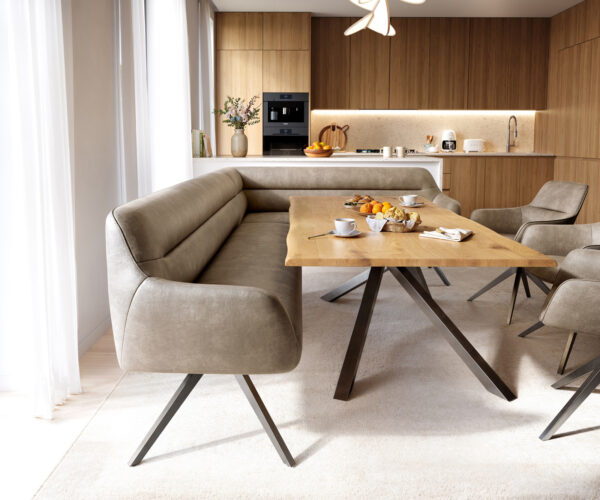 A jól átgondolt rendszerünk részeként a Taya sarokpad ideálisan kombinálható a Flex étkezőszékeinkkel és az Edge étkezőasztalokkal. Az alakok, vonalvezetés és lábak tökéletes harmóniában vannak egymással, és egységes összképet alkotnak az étkezőben. Ehhez a sarokmegoldáshoz különösen alkalmasak az 2 méter hosszú Edge étkezőasztalok. Ehhez illően ajánljuk a Flex székeket Yago, Zoa, Pejo, Heira vagy Xana modellekből, amelyeket kérésre azonos kárpittal választhat. Így egy stílusérzékkel bíró, tökéletesen összehangolt és karakteres étkezőhelyiség jön létre.