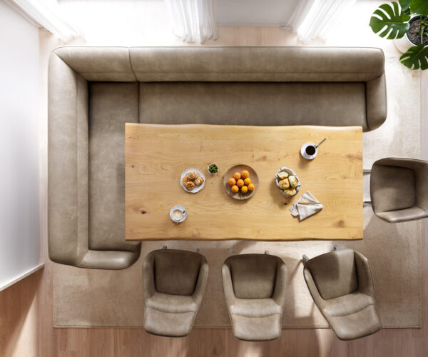 A jól átgondolt rendszerünk részeként a Taya sarokpad ideálisan kombinálható Flex étkezőszékeinkkel és Edge étkezőasztalainkkal. A formák, vonalvezetés és lábak tökéletes harmóniában vannak egymással, így egységes összképet alkotnak az étkezőben. Ehhez a sarokmegoldáshoz különösen alkalmasak az 2 méter hosszú Edge étkezőasztalok. Ehhez ajánljuk a Flex székeket Yago, Zoa, Pejo, Heira vagy Xana modellekből, amelyeket kérésre azonos huzatban is választhat. Így egy stílusos, tökéletesen összehangolt és karakteres étkezőteret hozhat létre.