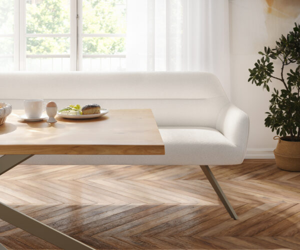 A Taya étkezőpad finom formavilágával és gondosan kidolgozott szegélyvarrásával lenyűgöz, amely kiemeli a lágyan ívelt vonalakat. Belsejében egy kiváló minőségű, habból készült (RG 40 kg/m³) szendvics szerkezet, valamint zsákrugós és hullámrugós alátámasztás biztosít kivételes üléskomfortot és hosszan tartó formastabilitást. A háttámla és az ülőfelület egyetlen, folyamatos kárpit elemből áll, amely nyugodt, prémium megjelenést kölcsönöz a padnak. A speciálisan tervezett fém láb rendkívüli stabilitást nyújt, és látható támasztólábak nélkül valósul meg – egy innovatív megoldás, amely a konzolos design-t megbízható állóképességgel ötvözi.