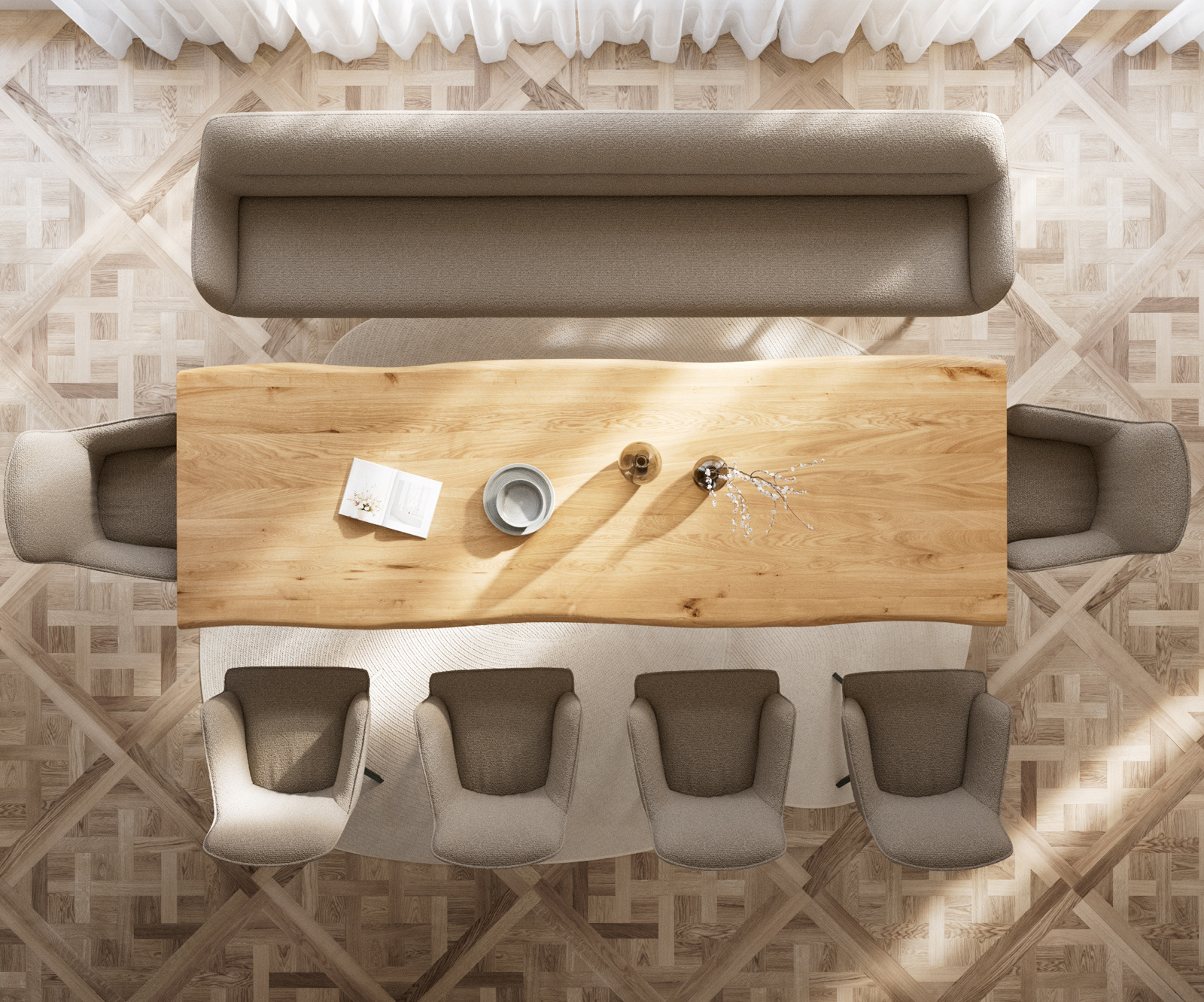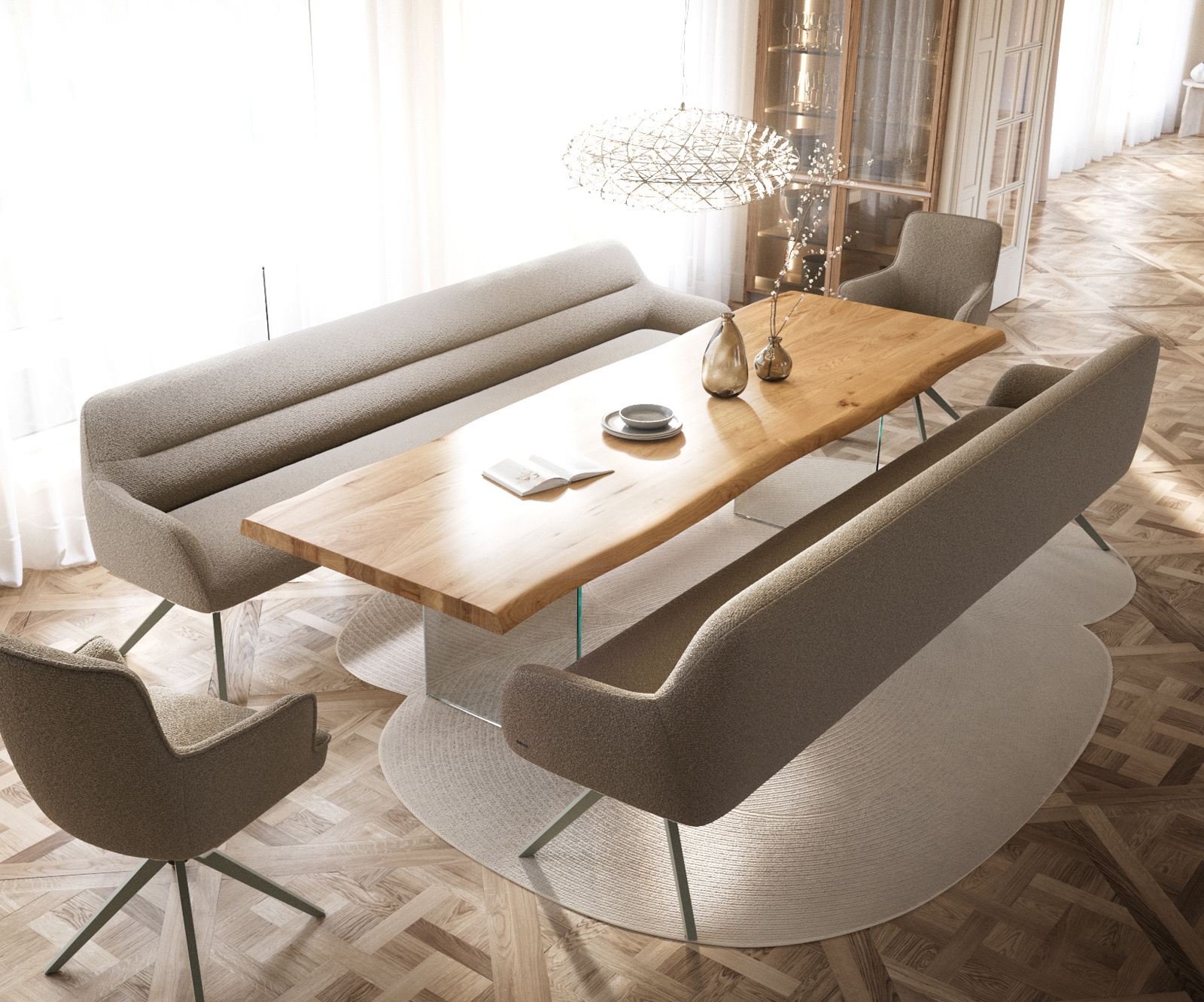 Flex étkezőszékeink és Edge étkezőasztalaink tökéletesen visszaverik a pad design nyelvezetét: formák, vonalvezetés és lábak harmonikusan illeszkednek egymáshoz. A 3 méter hosszú Edge asztalok optimálisan vannak ehhez igazítva. Ehhez illően ajánljuk a Flex székeket Yago, Zoa, Pejo, Heira vagy Xana modellekből, amelyeket kérésre azonos kárpittal választhat. Így egy stílusos, karakteres étkező jön létre, amely tudatosan összehangolt.