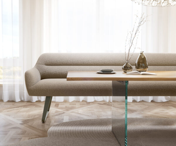 A Taya étkezőpad finom, filigrán formájával és gondosan kidolgozott szegélyvarrásával nyűgöz le, amely kiemeli a lágyan ívelt vonalakat. Belsejében egy kiváló minőségű, habból készült (RG 40 kg/m³) szendvics szerkezet, valamint zsákrugós és hullámrugós alátámasztás biztosít rendkívüli üléskomfortot és hosszan tartó formastabilitást. A háttámla és az ülőfelület egyetlen, folyamatos kárpitozott elemből áll, amely nyugodt, prémium megjelenést kölcsönöz a padnak. A speciálisan kifejlesztett fém láb rendkívüli stabilitást nyújt, és teljesen láthatatlan támasztólábak nélkül valósul meg – ez egy innovatív megoldás, amely a konzolos kialakítást megbízható állóképességgel ötvözi.