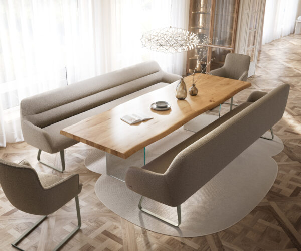 Flex étkezőszékeink és Edge étkezőasztalaink tökéletesen követik a pad design nyelvezetét: a formák, vonalvezetés és lábak harmonikusan illeszkednek egymáshoz. Az 3 méter hosszú Edge asztalok ideálisan vannak ehhez igazítva. Ehhez ajánljuk a Flex székeket Yago, Zoa, Pejo, Heira vagy Xana modellekből, amelyeket kérésre azonos kárpittal választhat. Így egy stílusos, karakteres és tökéletesen összehangolt étkezőhelyiség jön létre.