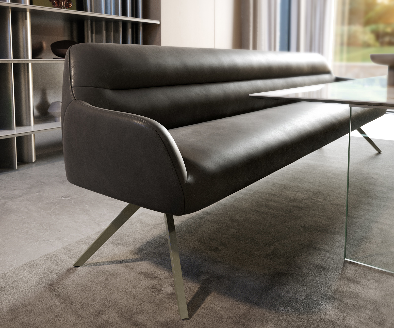 A szögletes kereszt láb egy gondosan kidolgozott design részlet. A keresztbe futó fémrudak rendkívüli precizitást igényelnek a gyártás során, és a padnak építészeti, erőteljes megjelenést kölcsönöznek.