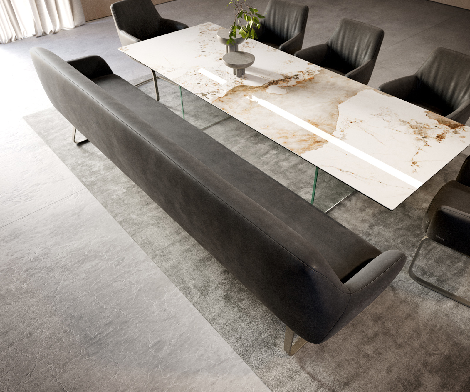 Flex étkezőszékeink és Edge étkezőasztalaink tökéletesen követik a pad design nyelvét: a formák, vonalvezetés és lábak harmonikusan illeszkednek egymáshoz. Az 3 méter hosszú Edge asztalok ideálisan illeszkednek hozzájuk. Ehhez ajánljuk a Flex székeket Yago, Zoa, Pejo, Heira vagy Xana modellekből, amelyeket kérésre azonos kárpittal választhat. Így egy stílusos, karakteres étkezőteret hozhat létre, amely tökéletes összhangban van.
