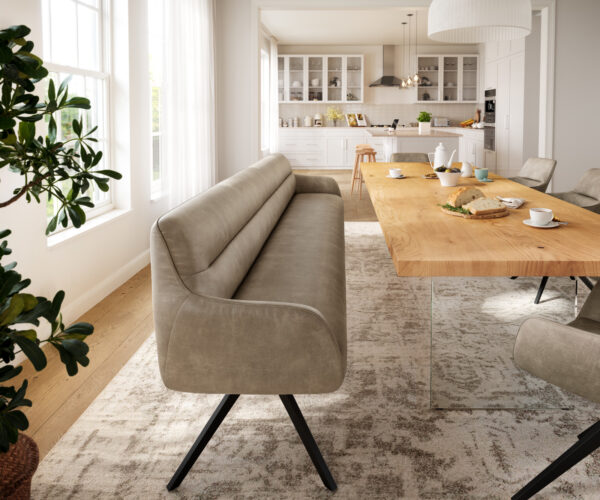 A fekete színű láb porfestett felülete egyenletes, matt réteget képez. Ez különösen karcálló, és könnyen tisztítható. A sötét árnyalat markáns, modern kisugárzást ad a padnak – ideális elegáns étkezőkhöz.