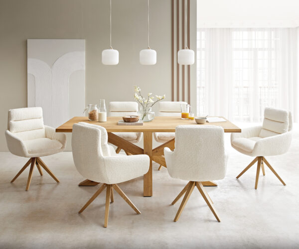 A feltűnő kereszt lábazat a klasszikus megjelenést négy szögletes lábbal természetes könnyedséggel ötvözi. Akár 180 fokban forgatható, és praktikus visszahúzó funkcióval rendelkezik, amely kellemesebbé teszi a beszélgetést az étkezőasztalnál.