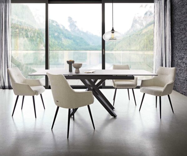 Az elegáns bouclé anyag különösen puha és kellemes a bőrnek, ugyanakkor strapabíró és könnyen tisztítható. Meleg fehér árnyalatban ragyog, és időtlenül szép akcentusokat helyez el bármely étkezőben.