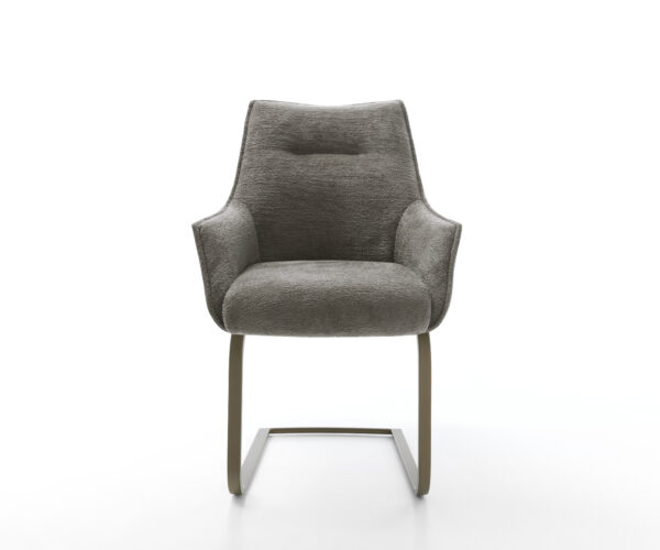 Ez a szék egy meleg, sötét bézs (schlamm) színű, magas minőségű bouclé kárpittal rendelkezik. A finom struktúra és a nyugodt szín modern, otthonos kisugárzást kölcsönöz a bútornak – ideális az étkezőbe vagy az olvasósarokba.
