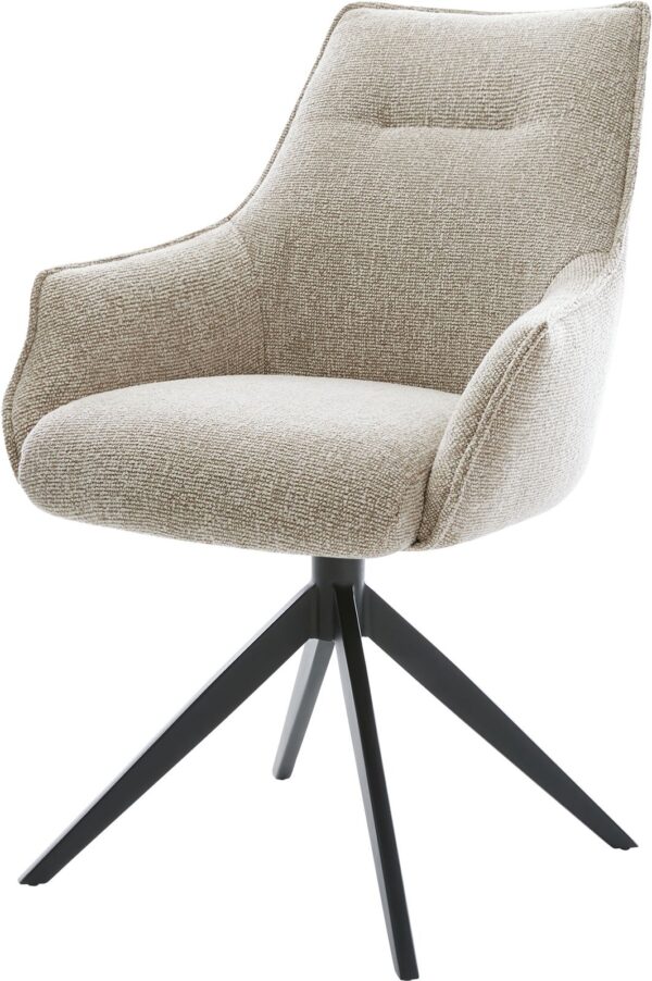 Ez a szék meleg, sötét bézs (schlamm) színű, magas minőségű bouclé huzattal rendelkezik. A finom struktúra és a nyugodt szín modern, otthonos kisugárzást kölcsönöz a bútornak – ideális az étkezőbe vagy az olvasósarokba.