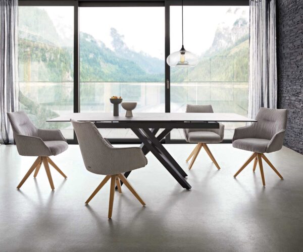 A feltűnő kereszt lábazat a klasszikus megjelenést négy szögletes lábbal természetes könnyedséggel ötvözi. Akár 180 fokban forgatható, és praktikus visszaforgató funkcióval rendelkezik, amely kellemesebbé teszi a beszélgetést az étkezőasztalnál.