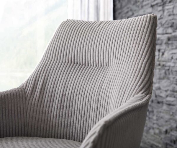 A használt kordbársony anyag különösen trendi, kellemes tapintású, könnyen ápolható és elegáns ezüstszürke színű.
