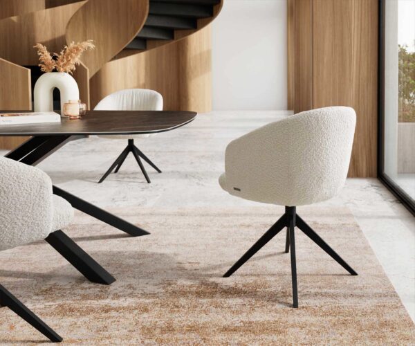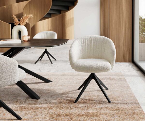 Az elegáns bouclé szövet különösen puha és kellemes tapintású, ugyanakkor strapabíró és könnyen tisztán tartható. Meleg fehér árnyalatban ragyog, időtlenül szép akcentusokat teremtve minden étkezőben.