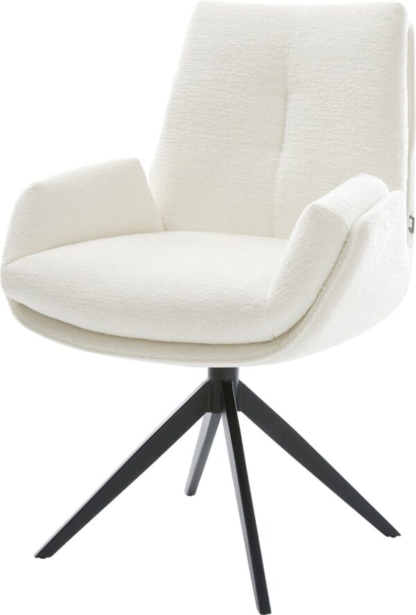Ez a szék magas minőségű, meleg sötét bézs (schlamm) színű bouclé kárpittal rendelkezik. A finom struktúra és a nyugodt szín modern, otthonos kisugárzást kölcsönöz a bútornak – ideális az étkezőbe vagy az olvasósarokba.