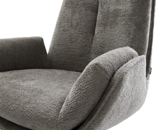 Ez a szék minőségi bouclé kárpittal rendelkezik meleg sötét bézs (schlamm) árnyalatban. A diszkrét struktúra és a nyugodt szín modern, otthonos kisugárzást kölcsönöz a bútornak – ideális az étkezőbe vagy az olvasósarokba.