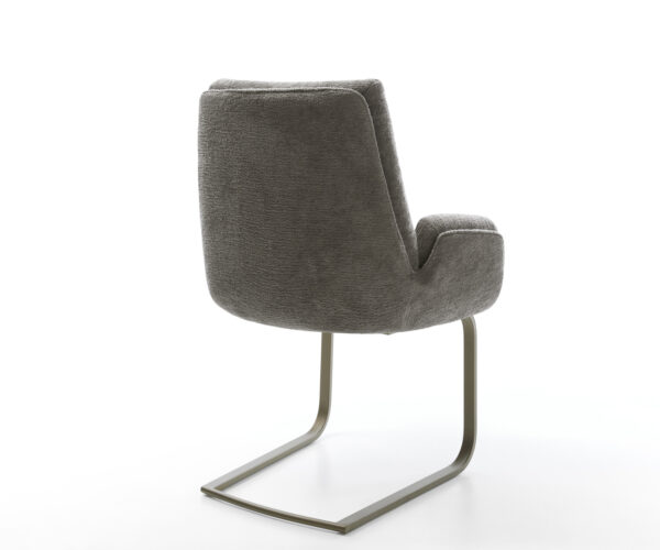 Ez a szék egy meleg sötét bézs (schlamm) színű, magas minőségű bouclé bevonattal rendelkezik. A finom struktúra és a nyugodt szín modern, otthonos kisugárzást kölcsönöz a bútornak – ideális az étkezőbe vagy az olvasósarokba.