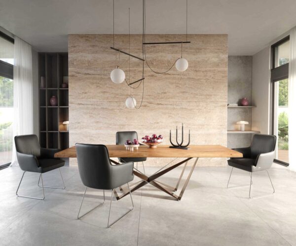 A vékony lábazat nyitott trapéz formájú, amely nagyon könnyed és diszkrét megjelenést kölcsönöz. Ez az elegáns visszafogottság lehetővé teszi, hogy a lábazat különösen egyszerűen illeszkedjen a meglévő berendezésbe.