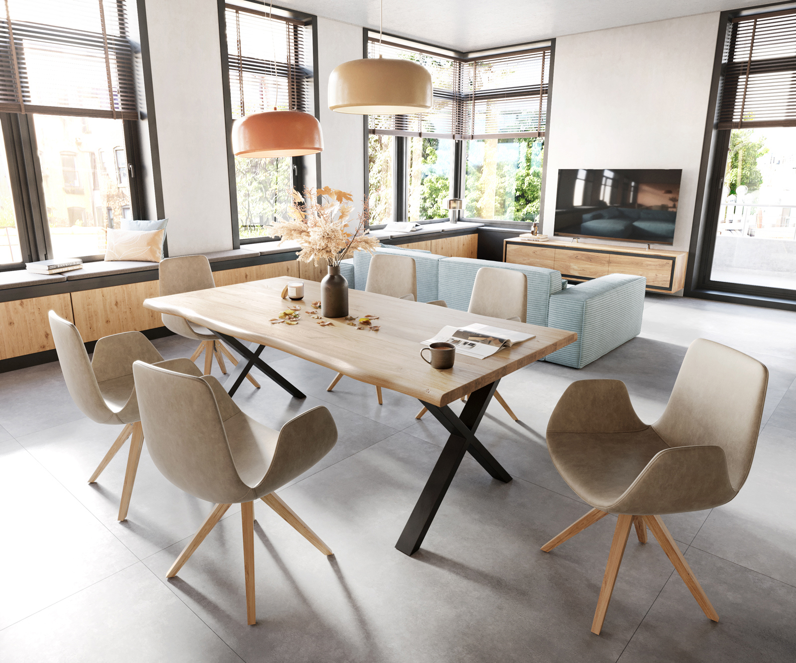 A modern kereszt láb kerek lábakkal az aktuális skandináv stílus ihletésében készült, és természetesen harmonikus megjelenést kölcsönöz minden Flex étkezőszéknek. A láb akár 180 fokban forgatható, és praktikus visszahúzó funkcióval rendelkezik.