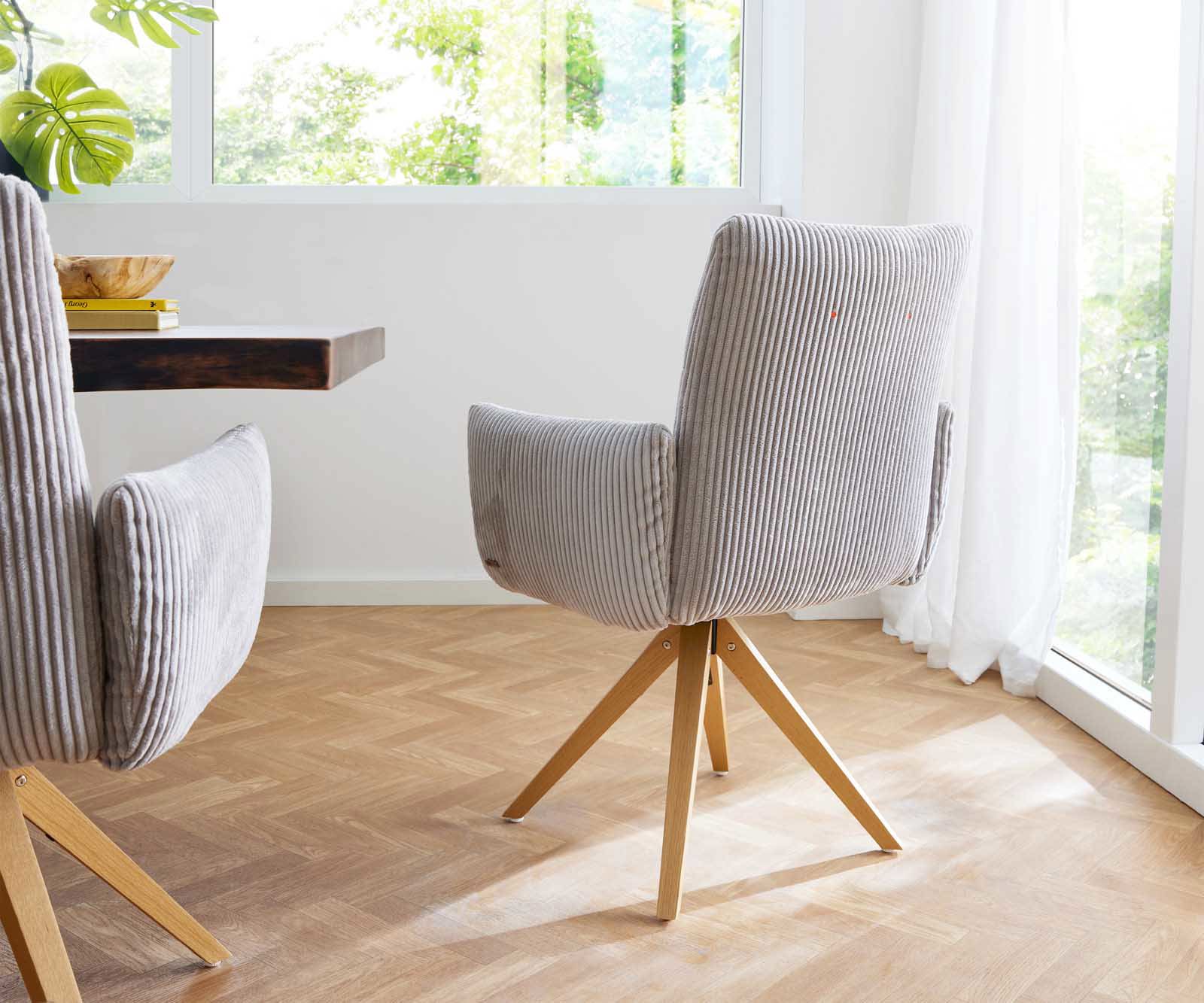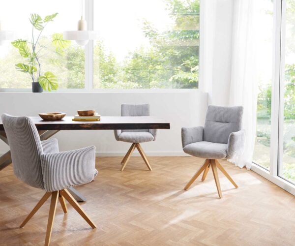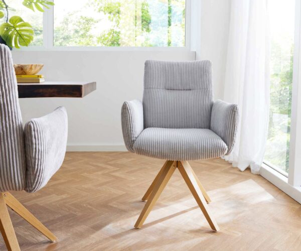 Étkezőszék Jova-Flex karfás kordbársony ezüstszürke fa láb szögletes természetes 180° forgatható zsákrugós