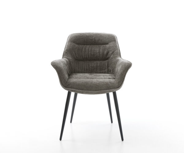 Ez a szék kiváló minőségű bouclé huzattal rendelkezik, meleg sötét bézs (schlamm) árnyalatban. A diszkrét struktúra és a nyugodt szín modern, otthonos kisugárzást kölcsönöz a bútornak – ideális az étkezőbe vagy az olvasósarokba.
