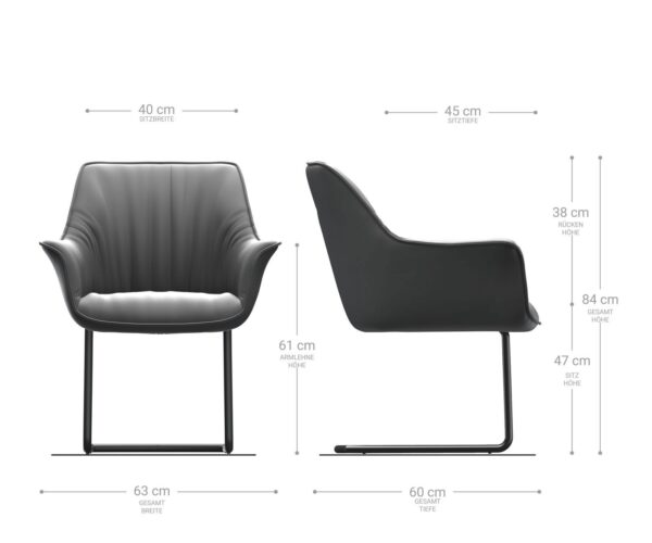 A kerek lábazat klasszikus freischwinger formában készült. Ez nemcsak különösen elegánssá teszi, hanem a könnyed hintamechanizmus révén egészséges testtartást és kényelmes ülést biztosít.