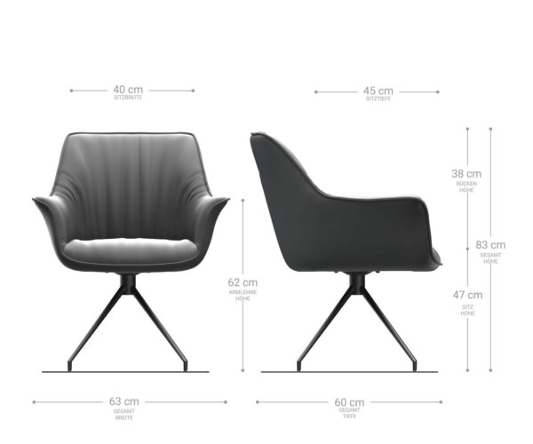 A különleges kereszt láb formája lágyan kúposan ívelt, lefelé hajló lábakkal, így abszolút figyelemfelkeltő. Négy lábának köszönhetően a lábazat különösen stabil, praktikus visszahúzó funkcióval és 180 fokos forgathatósággal egyedülálló kényelmet biztosít.