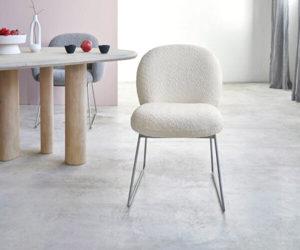 Az elegáns bouclé szövet különösen puha és kellemes a bőrnek, ugyanakkor strapabíró és könnyen tisztán tartható. Meleg fehér árnyalatban ragyog, és időtlenül szép akcentusokat helyez el bármely étkezőben.