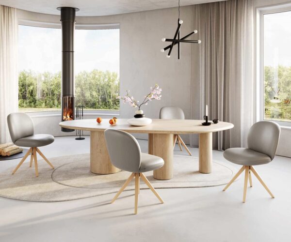 A feltűnő kereszt láb klasszikus megjelenést ötvöz négy szögletes lábbal és természetes könnyedséggel. Akár 180 fokban forgatható, és praktikus visszahúzó funkcióval rendelkezik, amely kellemesebbé teszi az étkezőasztal melletti beszélgetéseket.
