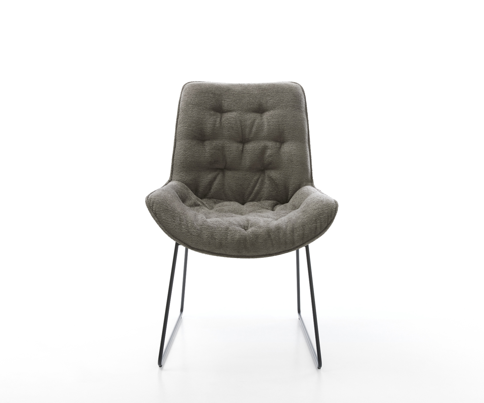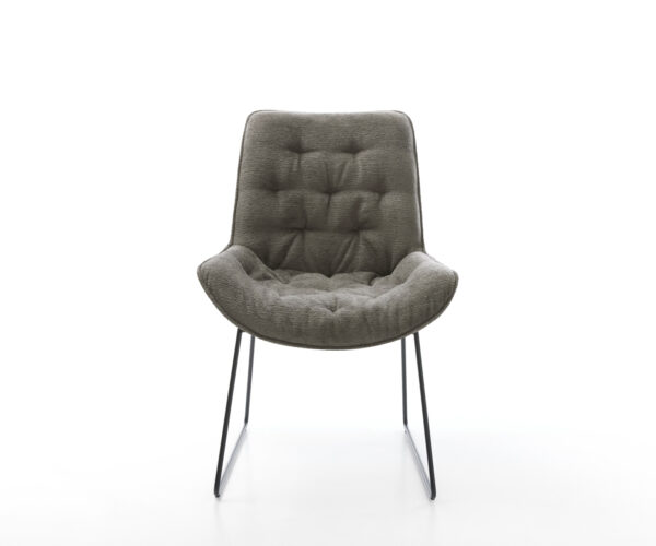 Ez az étkezőszék magas minőségű bouclé kárpittal rendelkezik meleg sötét bézs (schlamm) árnyalatban. A finom struktúra és a nyugodt szín modern, otthonos kisugárzást kölcsönöz a bútornak – ideális az étkezőbe vagy az olvasósarokba.