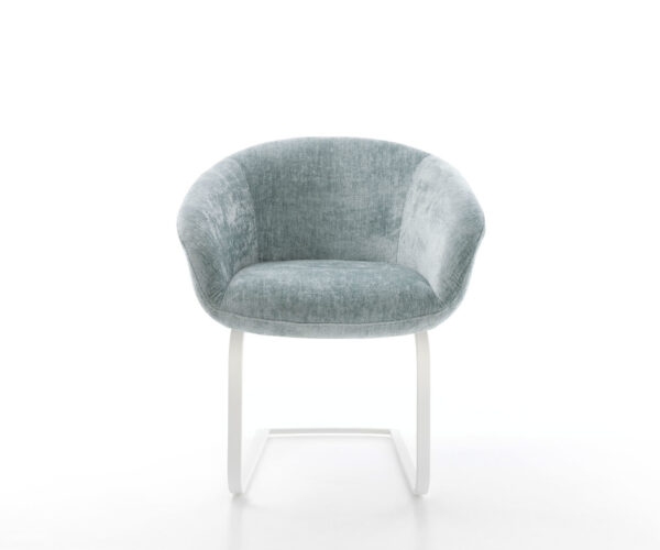 A kiváló minőségű chenille szövet és a stílusos design kombinációja valódi figyelemfelkeltővé teszi ezt a széket. A szövet sima, majdnem bársonyos felülete nemcsak elegáns megjelenést biztosít, hanem különösen könnyen tisztán tartható. Időtálló, lágy pasztellkék színével barátságos és hívogató légkört teremt az étkezőben.