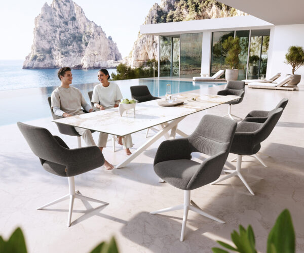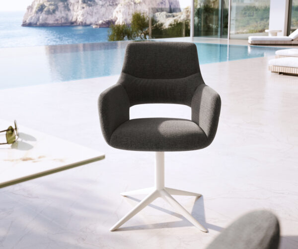 A Yago-Flex a beltéri otthonosságot hozza ki a szabadba. Áttört háttámlájával, finoman ívelt karfáival és elegáns díszvarrásával könnyed, elegáns és csodálatosan otthonos hatást kelt. A vízáteresztő komforthab támogatja a kültéri használatot, így stílusos választás teraszra, erkélyre és beltérbe egyaránt. Így jön létre egy kültéri étkezőszék, amely bármilyen környezetben kivételesen harmonikusan hat.