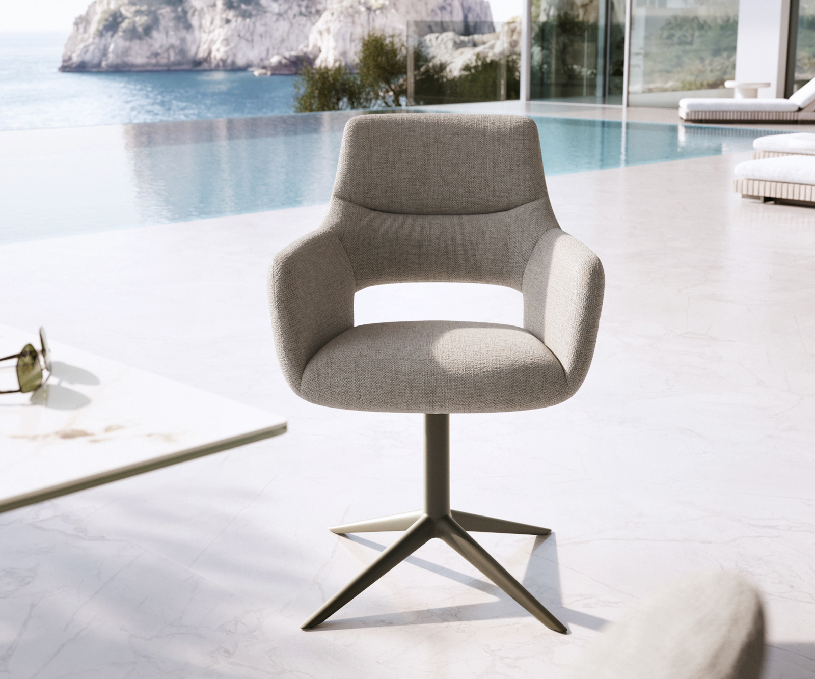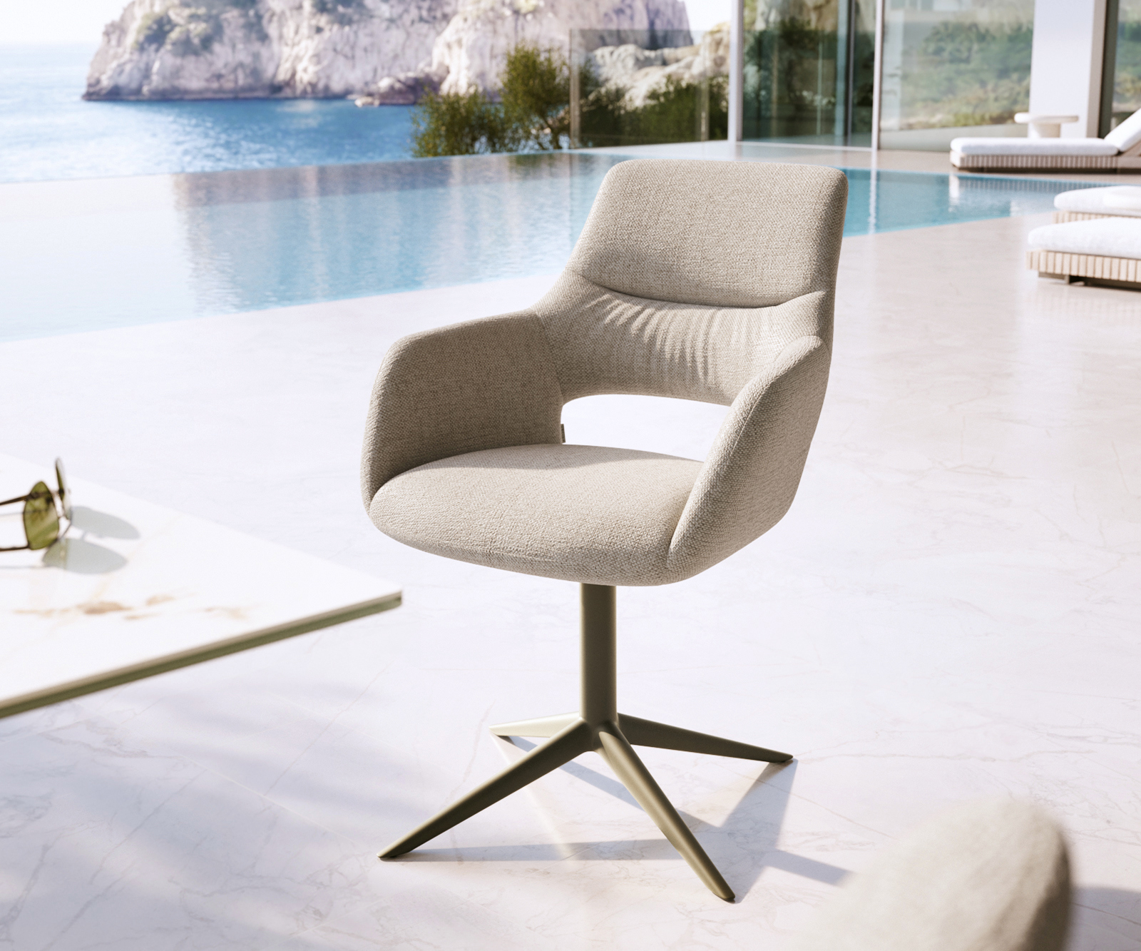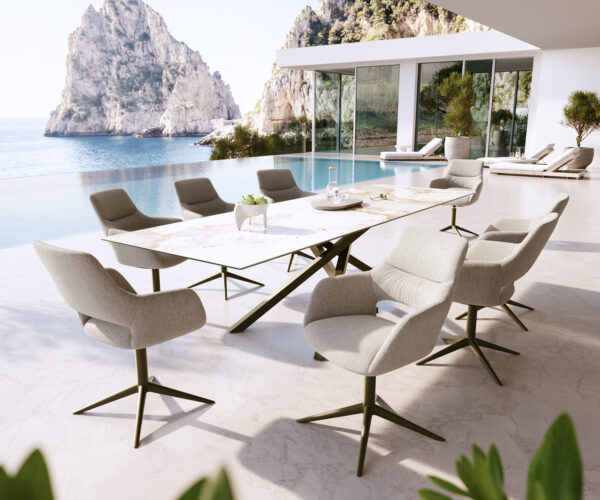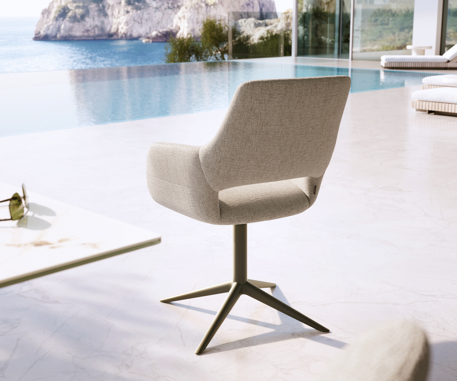 A Yago-Flex a beltéri otthonosságot hozza ki a szabadba. Áttört háttámlával, lágyan ívelt karfákkal és finom díszvarrással könnyed, elegáns és csodálatosan otthonos megjelenést kölcsönöz. A vízáteresztő komforthab támogatja a kültéri használatot, így stílusos választás teraszra, erkélyre és beltéri térbe egyaránt. Így jön létre egy kültéri étkezőszék, amely bármilyen környezetben rendkívül harmonikusan hat.
