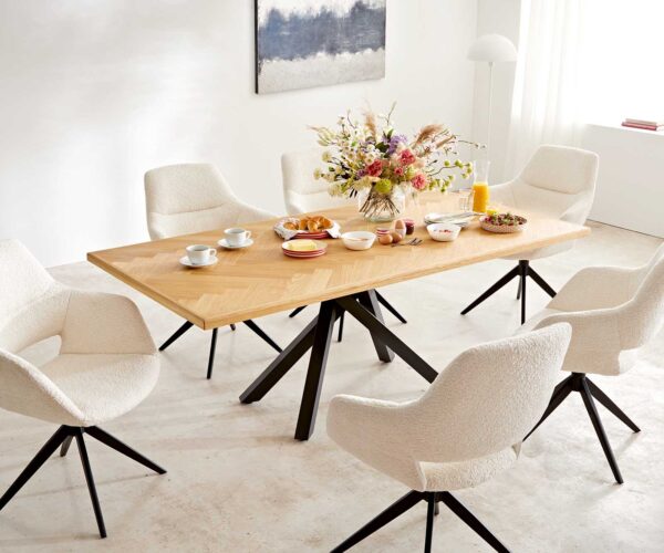 Az elegáns bouclé anyag különösen puha és kellemes a bőrnek, ugyanakkor strapabíró és könnyen tisztán tartható. Meleg fehér árnyalatban ragyog, és időtlen, szép akcentusokat teremt minden étkezőben.