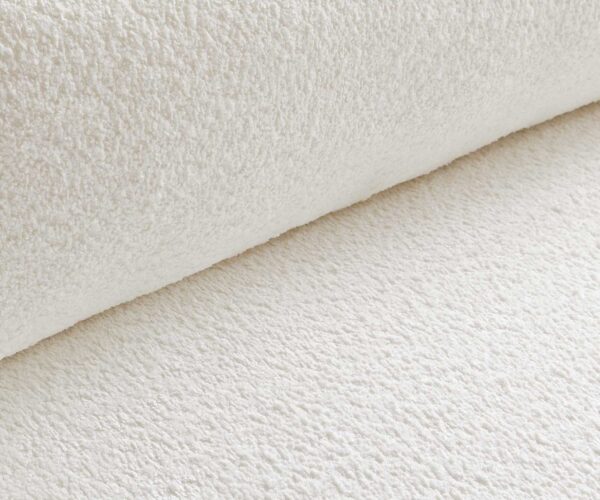 • Fehér bouclé szövet puha tapintással és finom struktúrával